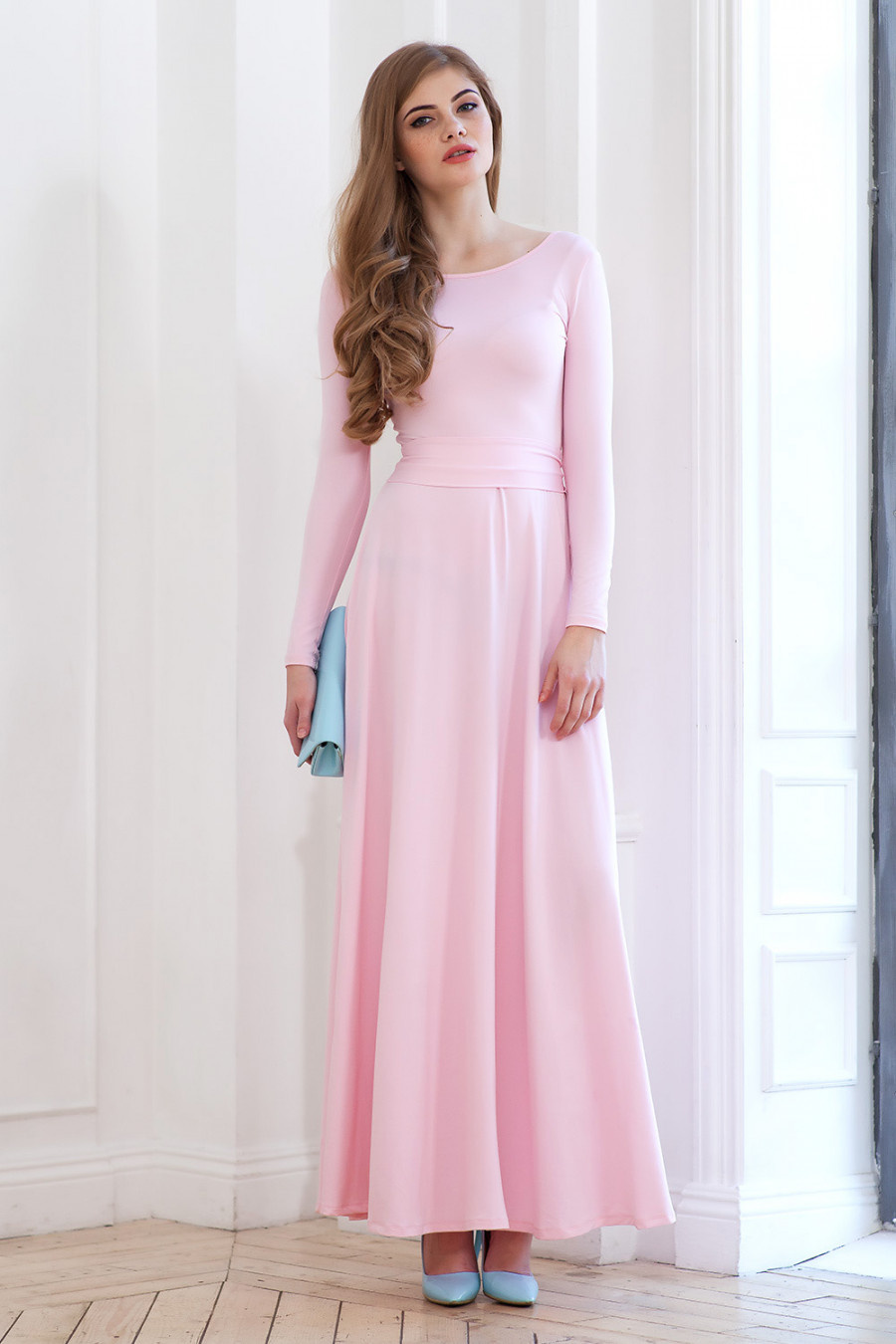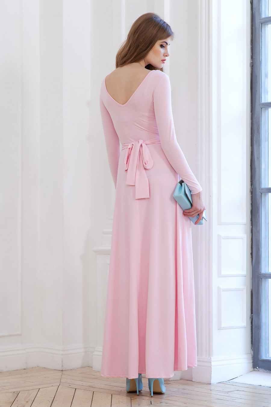 Элегантное платье из струящегося трикотажа длиной в пол с длинным рукавом. Сзади V-образный вырез горловины. На талии завязывается пояс.
