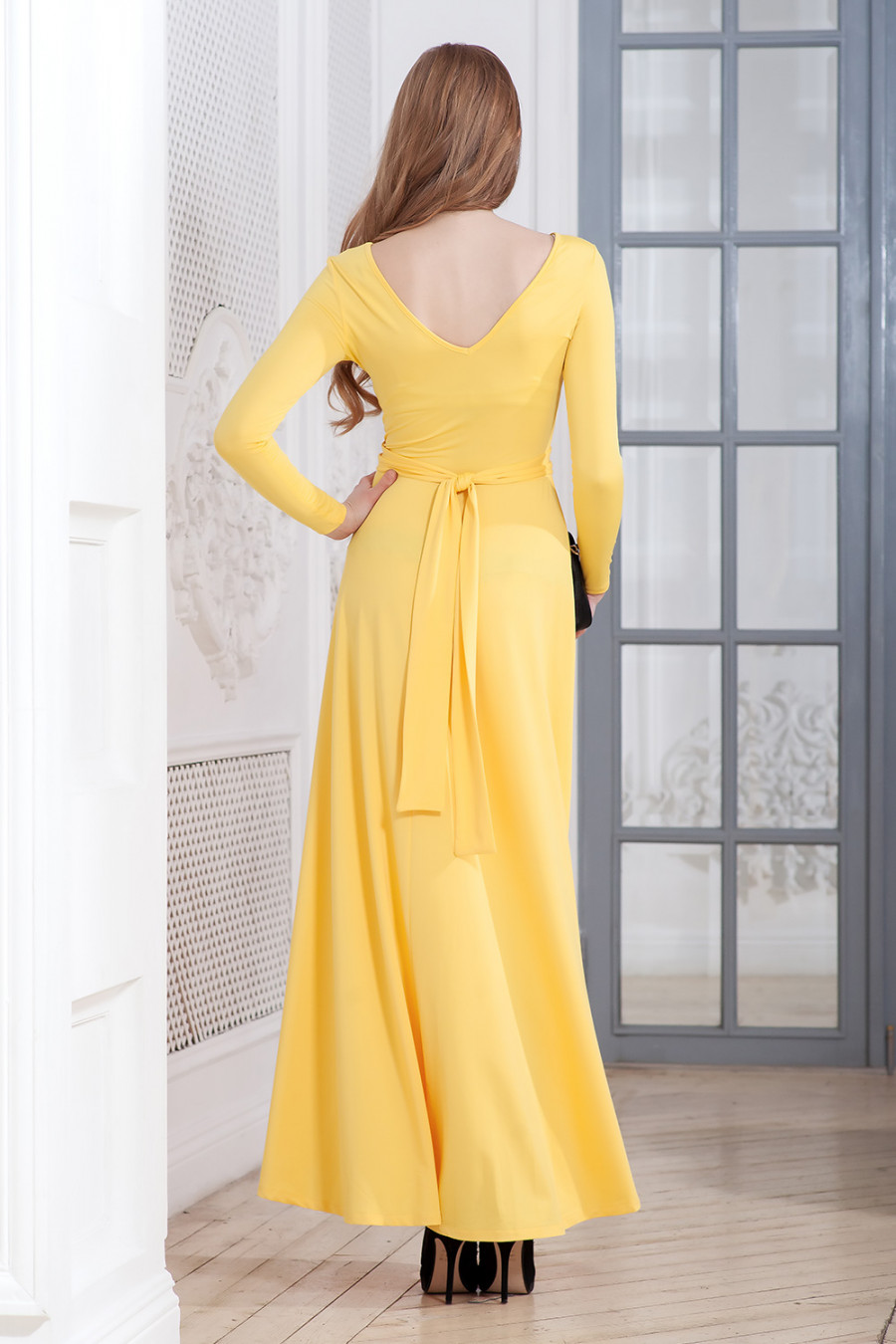 Элегантное платье из струящегося трикотажа длиной в пол с длинным рукавом. Сзади V-образный вырез горловины. На талии завязывается пояс.