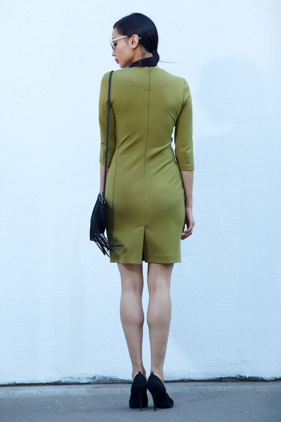 Элегантное платье футляр из джерси. Платье облегающего силуэта с рукавом 3/4 и округлым вырезом горловины. Сзади шлица и застежка на потайную молнию.