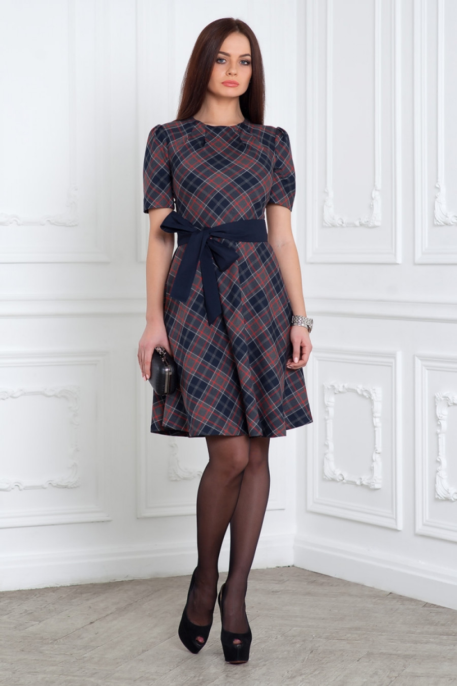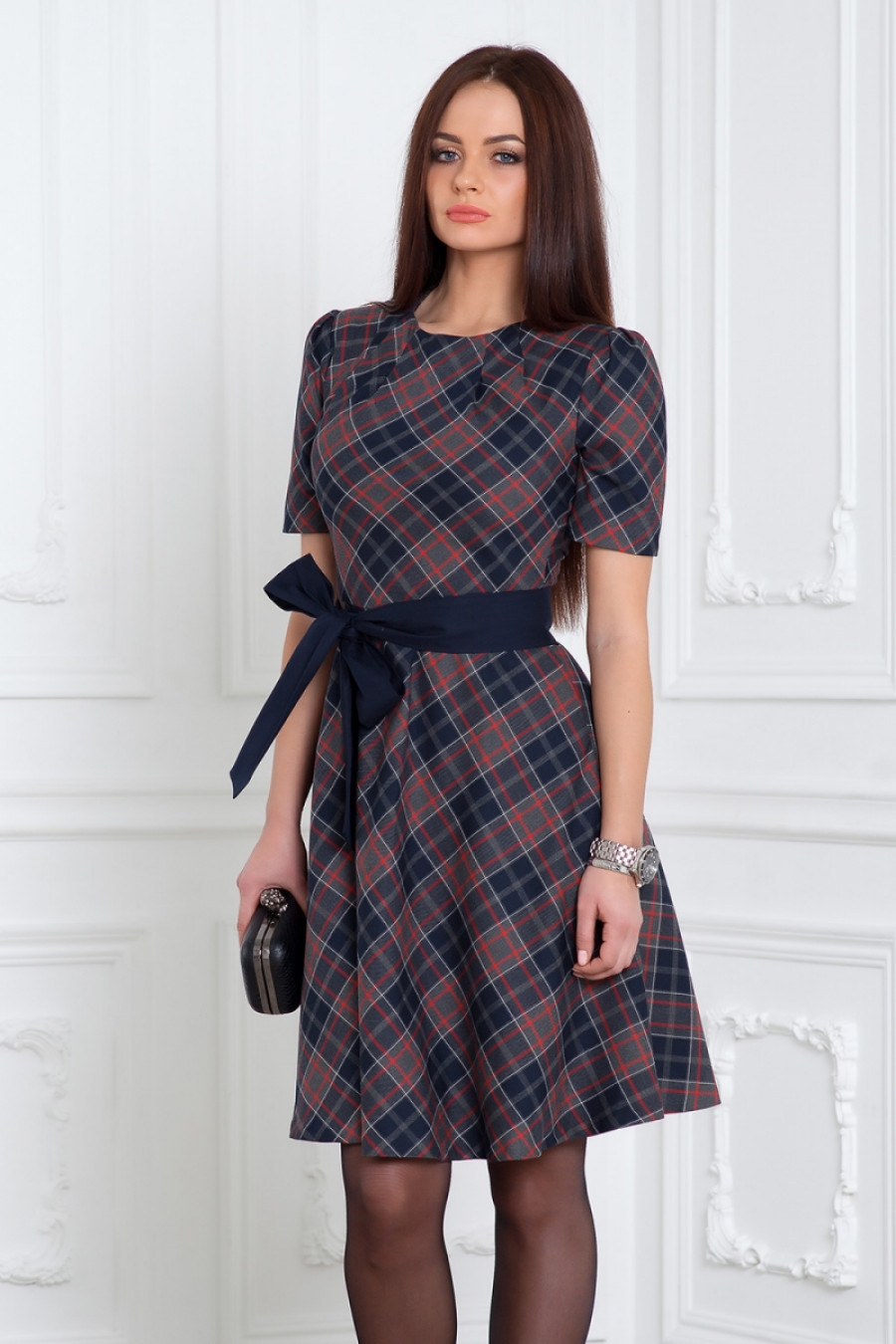 Элегантное платье с коротким рукавом и пышной юбкой. Талию подчеркнет матерчатый пояс, оформленный в виде банта.