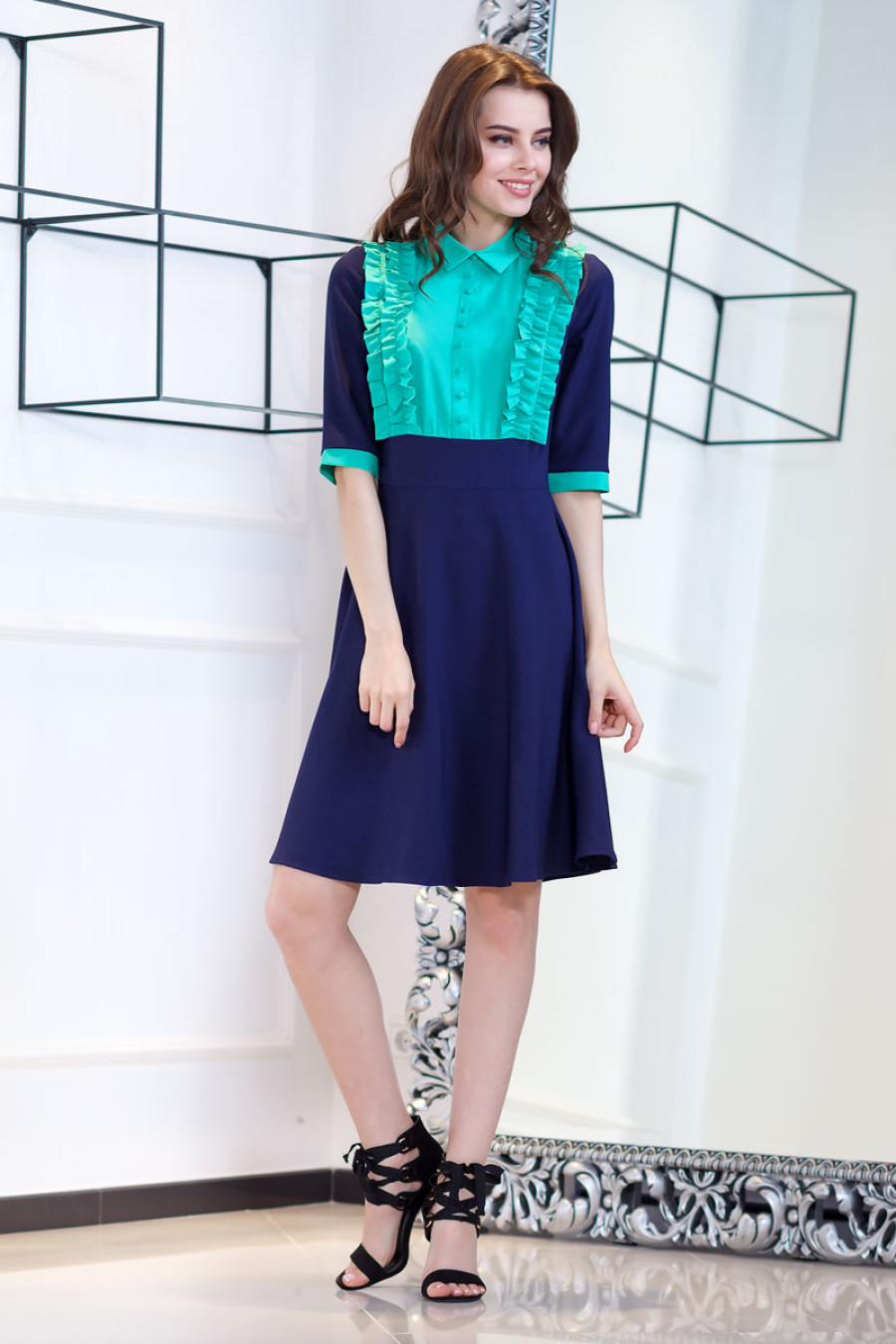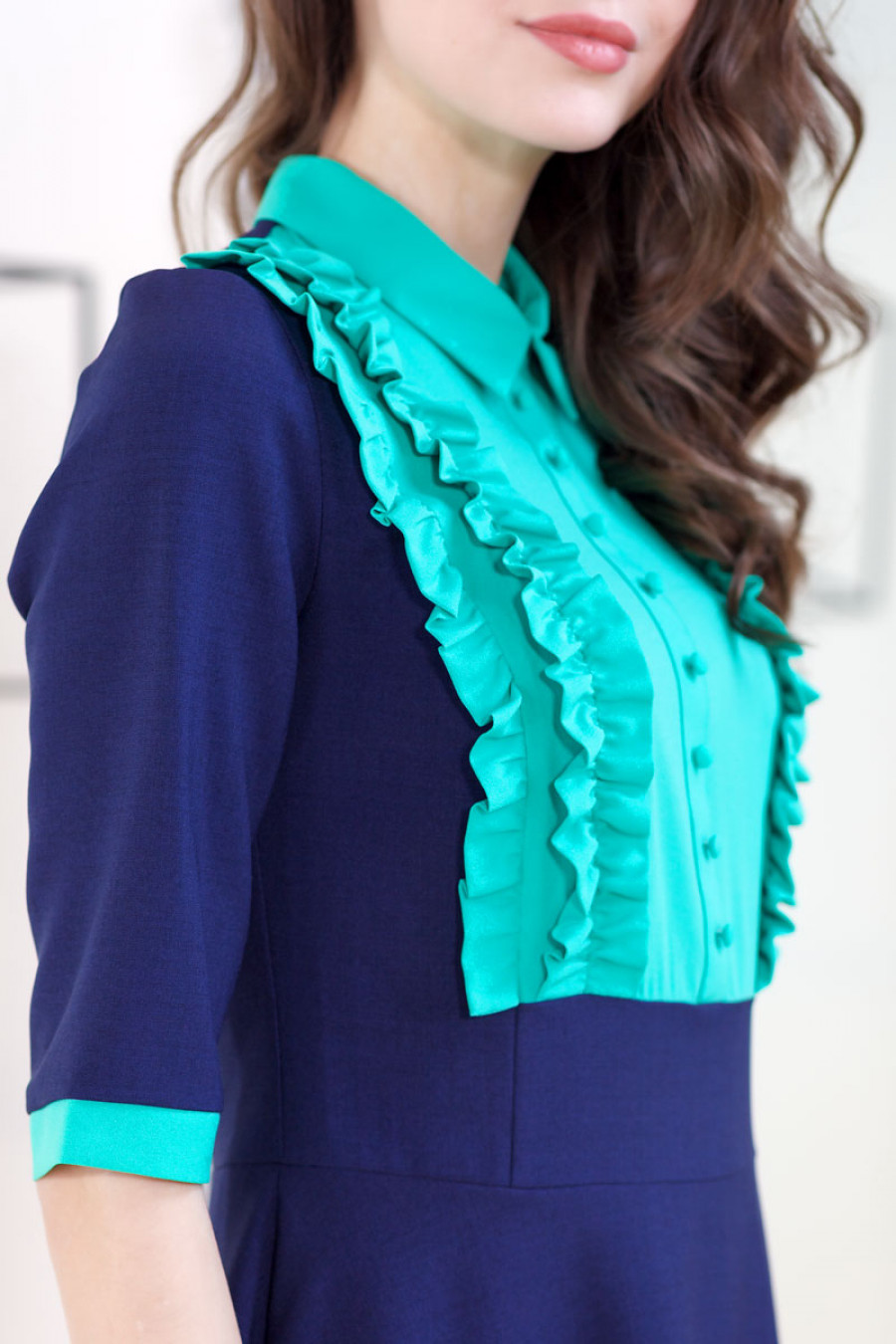 Элегантное платье из ткани костюмной группы. Модель приталенного силуэта с юбкой клеш. Лиф декорирован двумя рядами рюш и отделочной планкой с пуговицами. Горловина оформлена аккуратным воротничком. Рукав 3/4 с манжетом. Сзади застежка на потайную молнию.