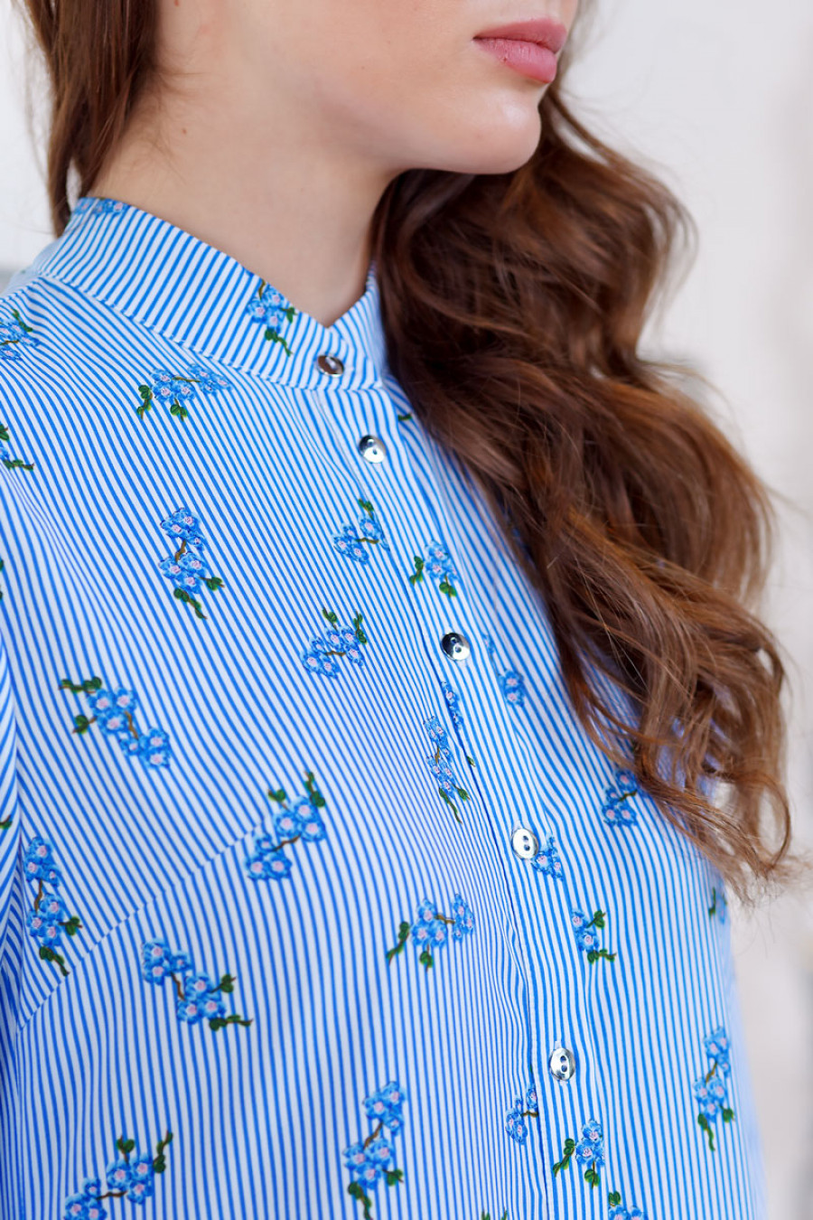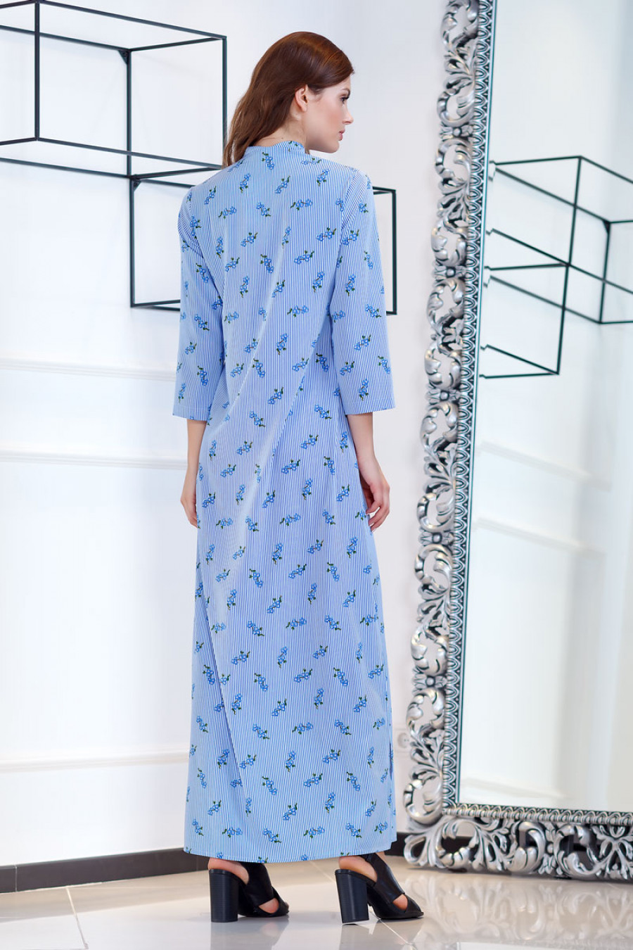 Платье макси прямого силуэта из плательной ткани с принтом в мелкую полоску и цветами. Модель с воротником-стойкой, спереди планка на пуговицах, по низу боковых швов выполнены разрезы. Втачной рукав 7/8 можно подвернуть и закрепить патой с пуговицей.