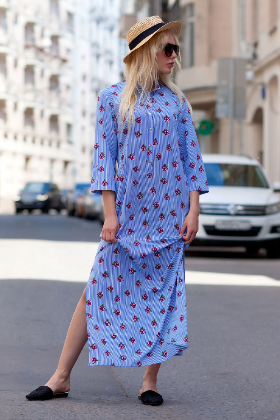 Платье макси прямого силуэта из плательной ткани с принтом в мелкую полоску и цветами. Модель с воротником-стойкой, спереди планка на пуговицах, по низу боковых швов выполнены разрезы. Втачной рукав 7/8 можно подвернуть и закрепить патой с пуговицей.