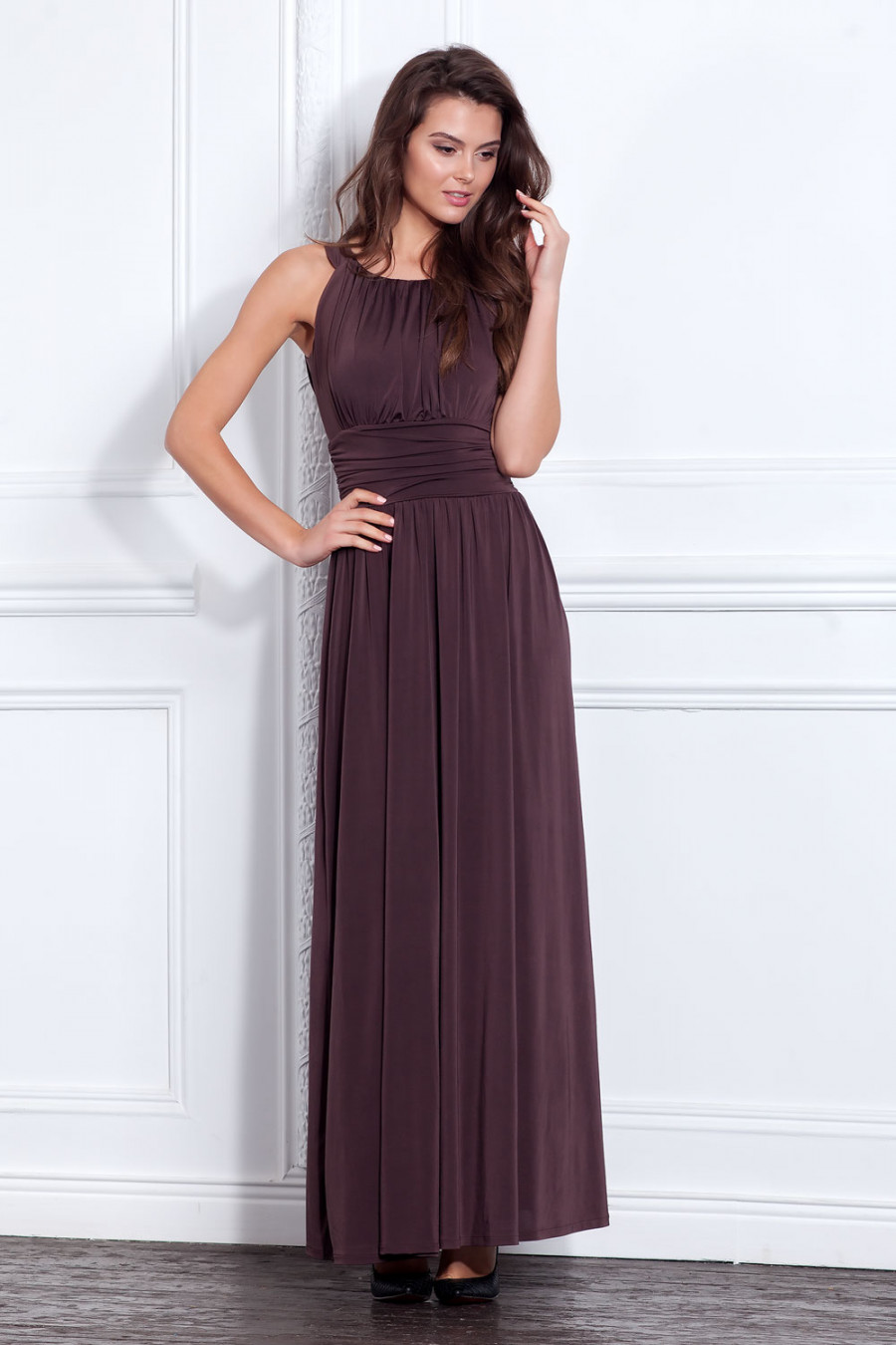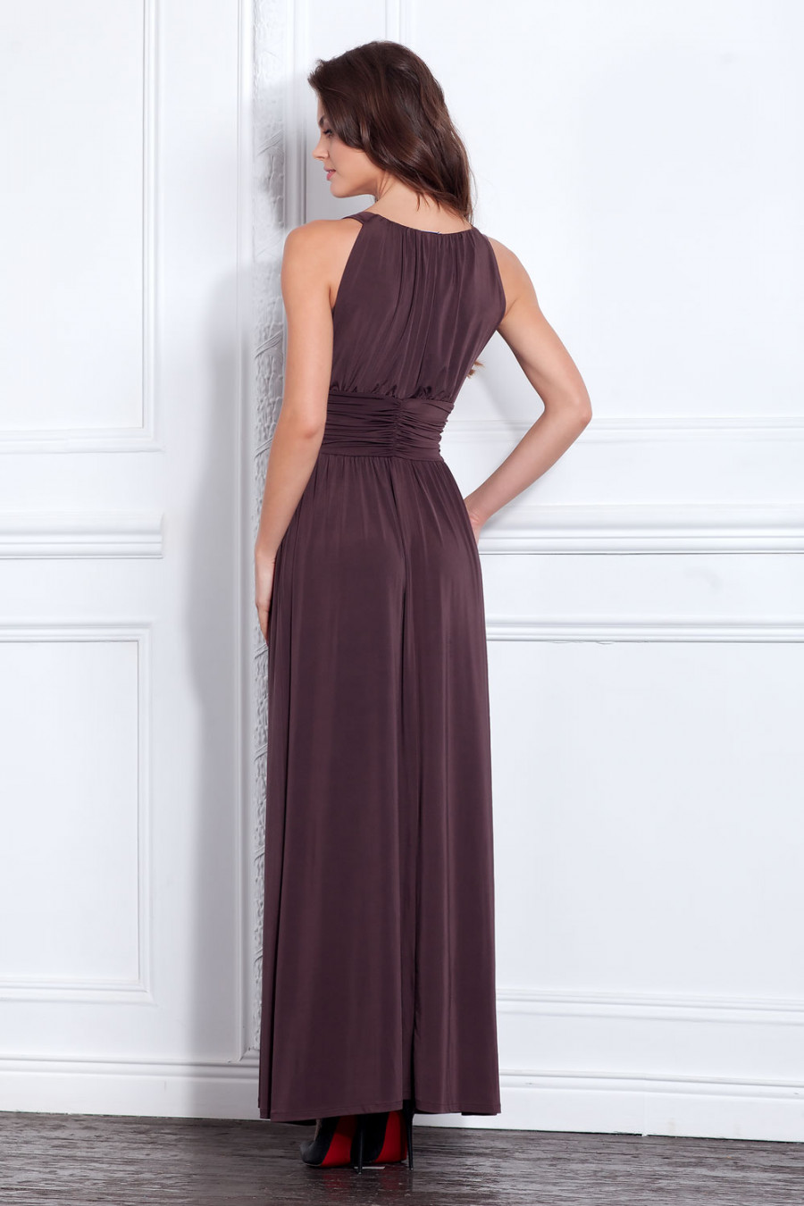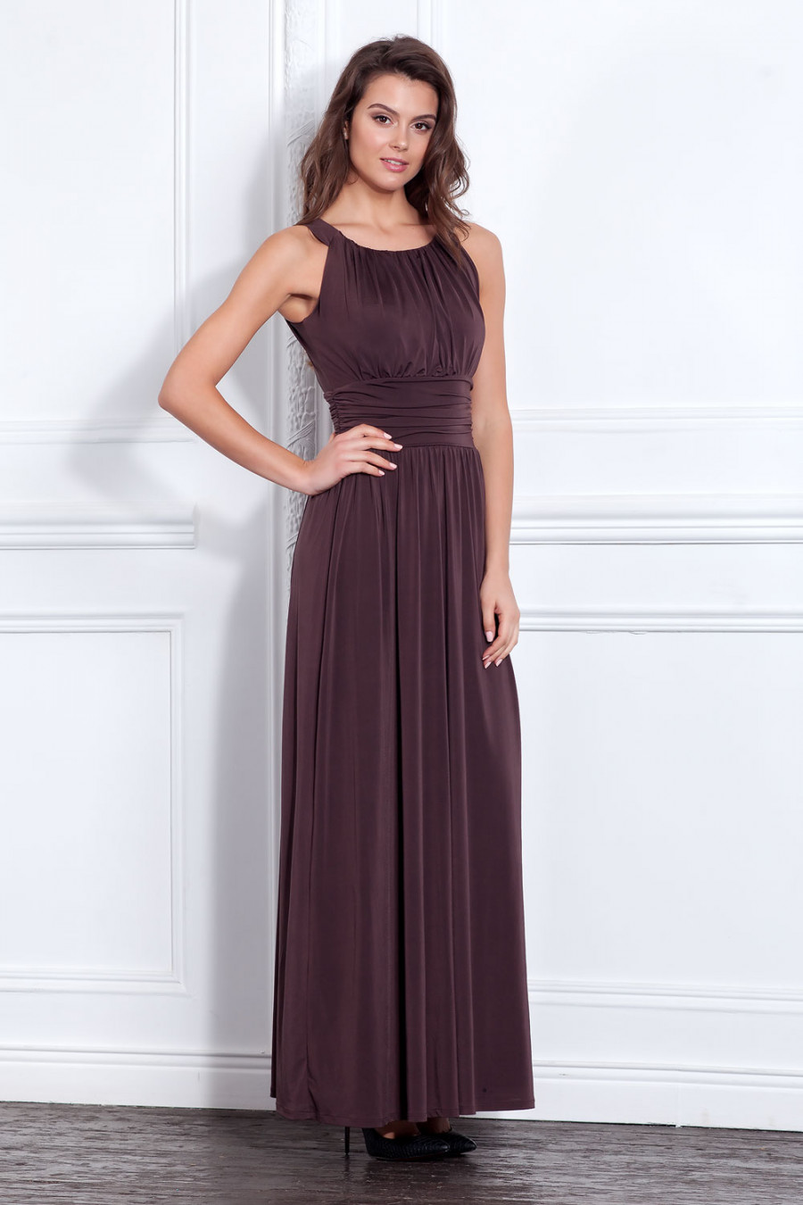 Эффектное платье без рукавов из струящегося трикотажа длиной в пол. Лиф и пояс украшены драпировкой. Изящная и нарядная модель для создания женственного образа.
