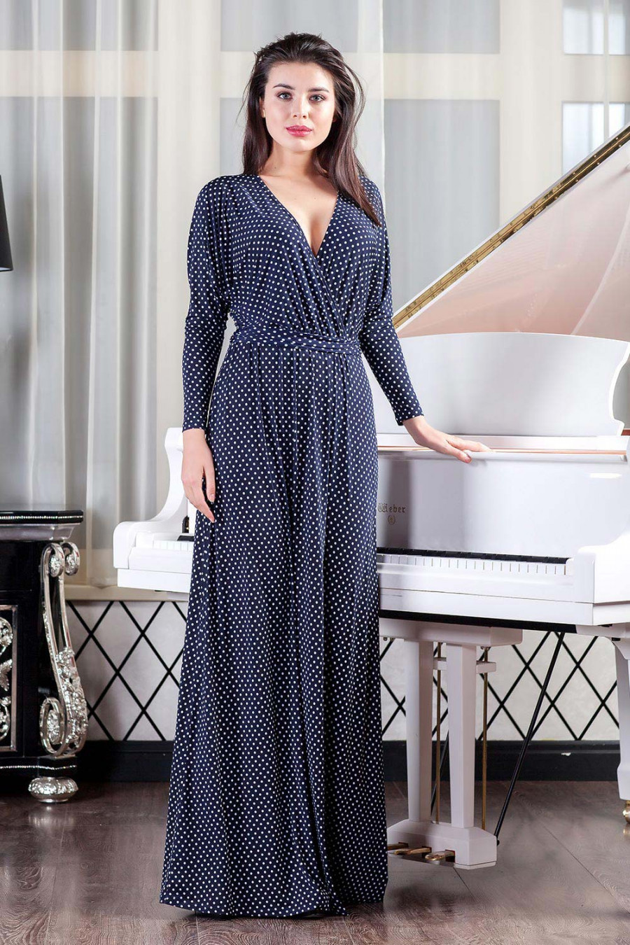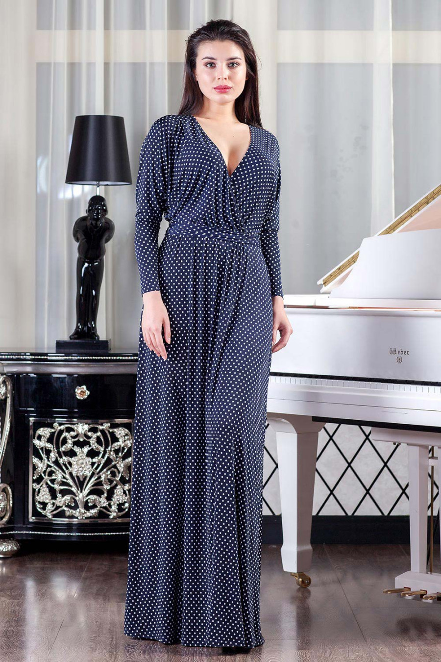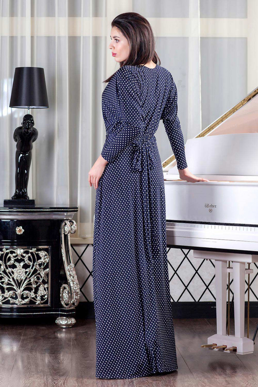 Платье из принтованного масла длиной в пол отрезное по линии талии. Рукав длинный "летучая мышь". Впереди глубокий V-образный вырез с запахом. На талии завязывается пояс.