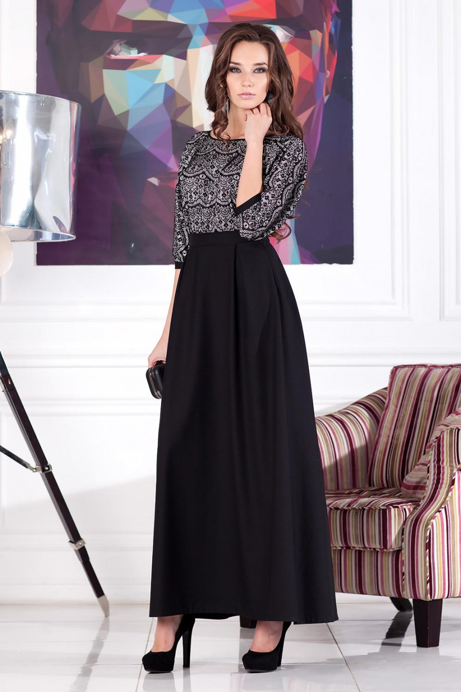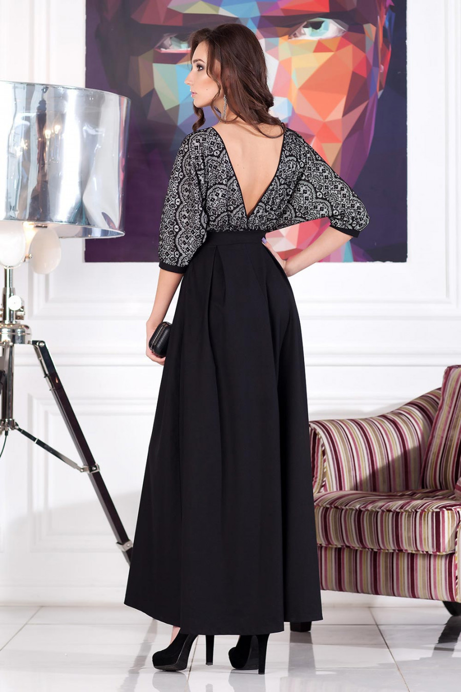 Элегантное платье длиной в пол с цельнокроеным рукавом "летучая мышь". Юбка клеш со складками из плотного текстиля. Верх с глубоким вырезом на спинке из легкой драпирующейся ткани с кружевным принтом. Застежка молния в боковом шве.