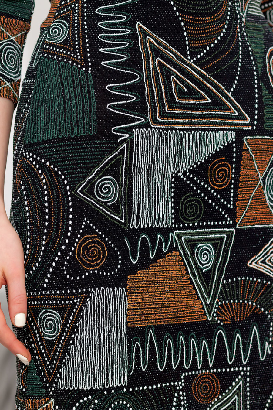 Эффектное платье мини из трикотажа с абстрактным рисунком. Модель облегающего силуэта с рукавом 3/4. Вырез горловины лодочка оформлен по спинке складками "качели".