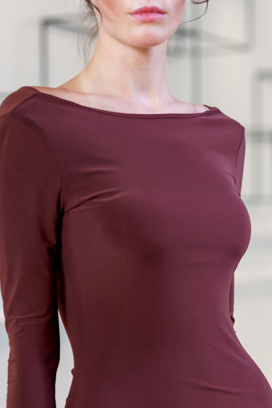 Эффектное платье мини из однотонного трикотажа. Модель облегающего силуэта с рукавом 3/4. Вырез горловины лодочка оформлен по спинке складками "качели".