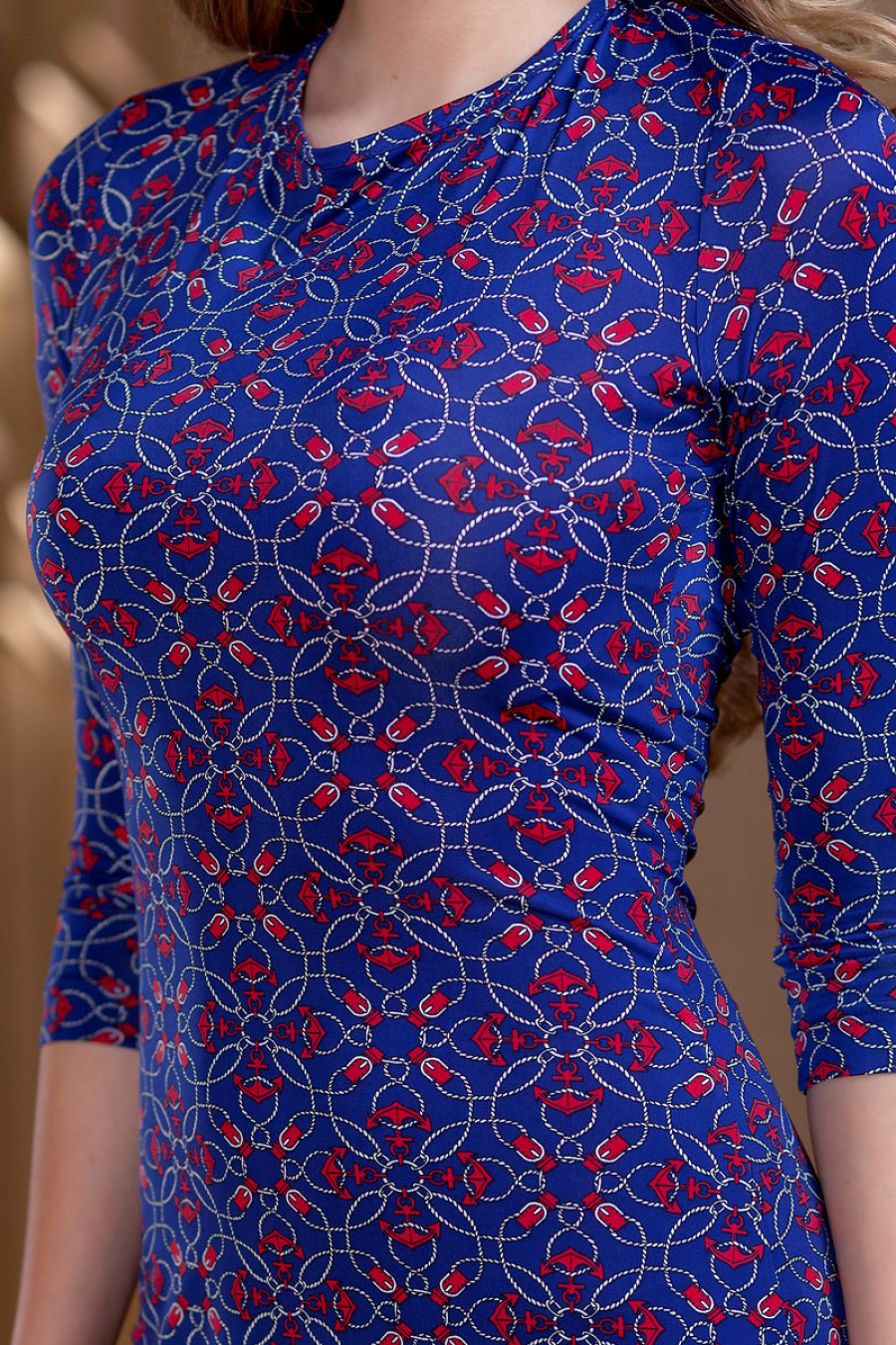 Эффектное платье мини из трикотажа с абстрактным принтом. Модель облегающего силуэта с рукавом 3/4. Вырез горловины "лодочка" оформлен по спинке складками "качели".