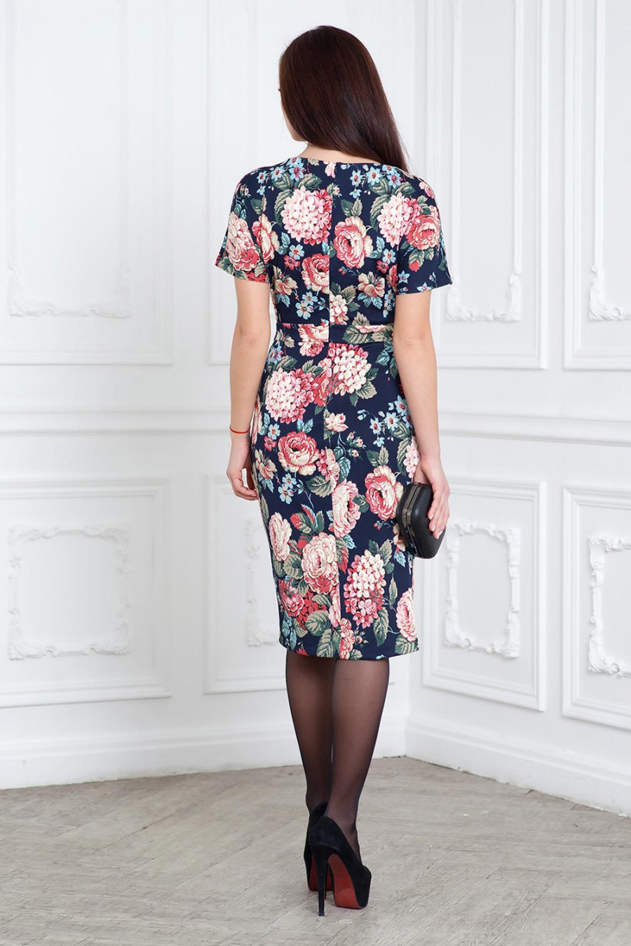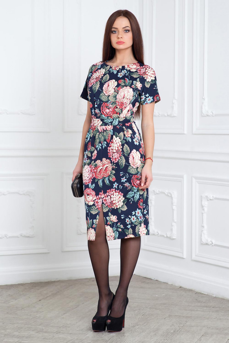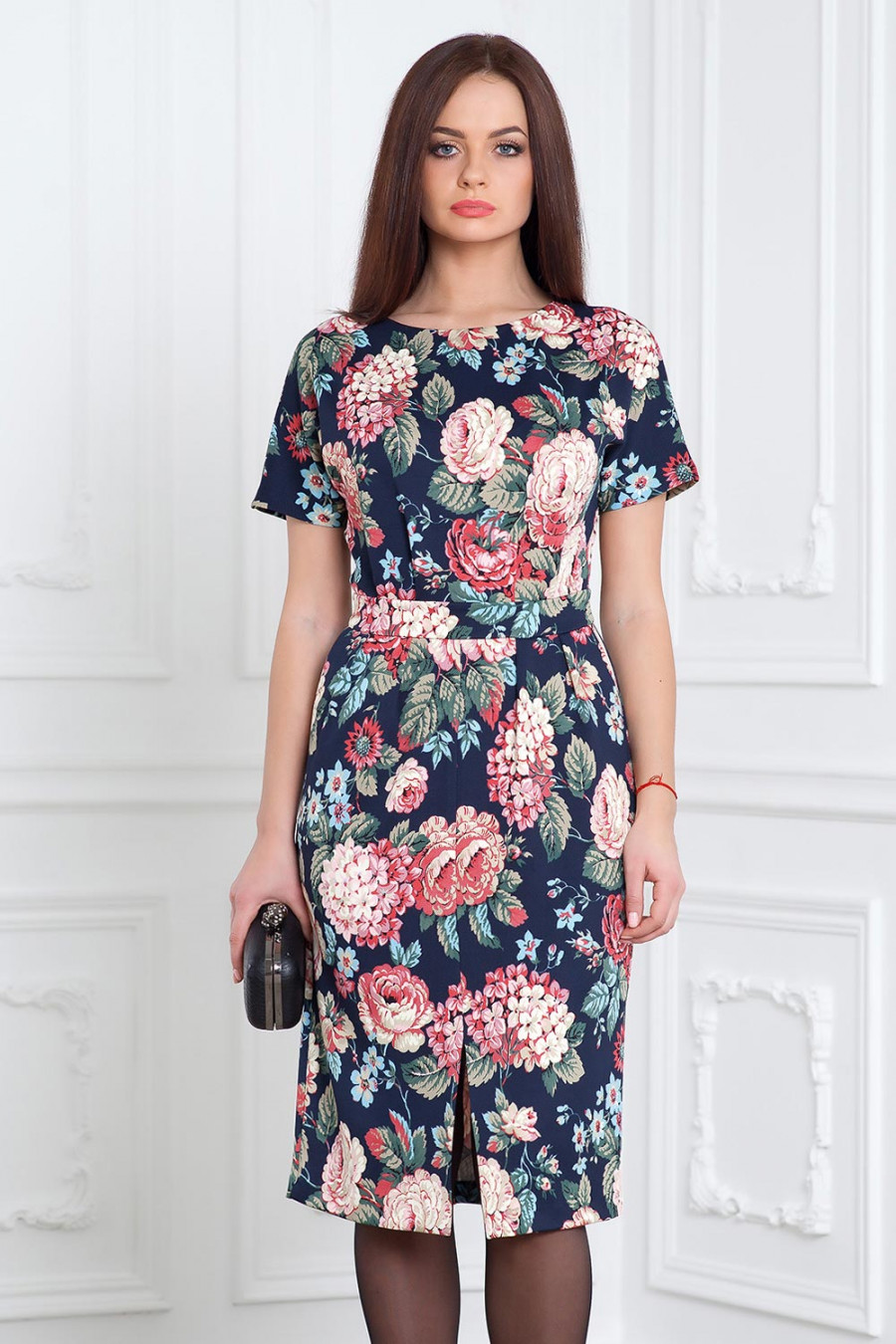 Платье из принтованного трикотажного полотна прямое отрезное по талии с втачным поясом. На лифе и на юбке складки от талии. В боковых швах карманы. Застежка-молния в среднем шве спинки.