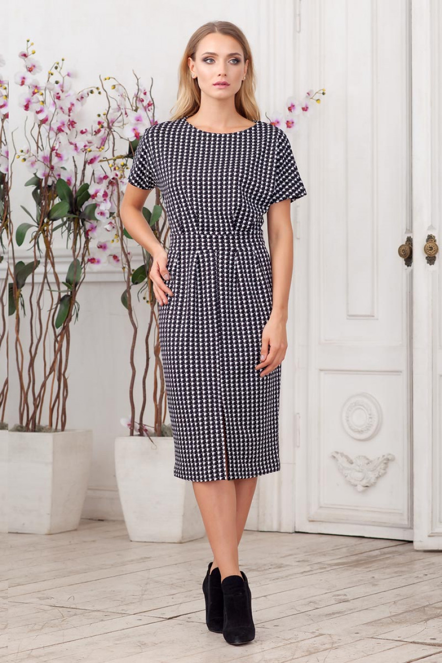 Элегантное платье-футляр из структурного трикотажа с геометрическим принтом. Модель приталенного силуэта, отрезная по линии талии. Лиф с цельнокроенным коротким рукавом "летучая мышь" декорирован складками от пояса. Юбка прямая длиной до колена ...