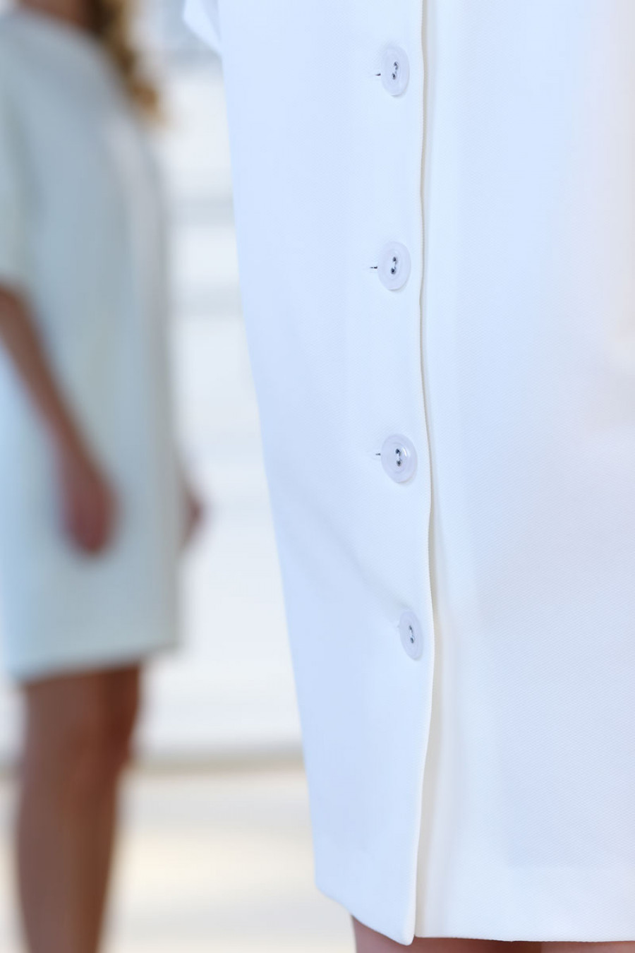 Платье из трикотажного структурного полотна прямое длиной до колена с рукавом 3/4. Впереди карманы в швах от бока. Сзади застежка на пуговицы. Рукав со складками.