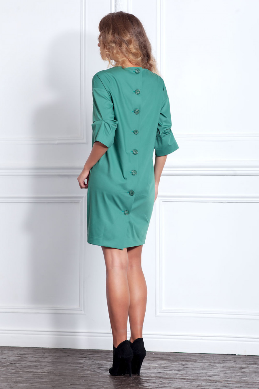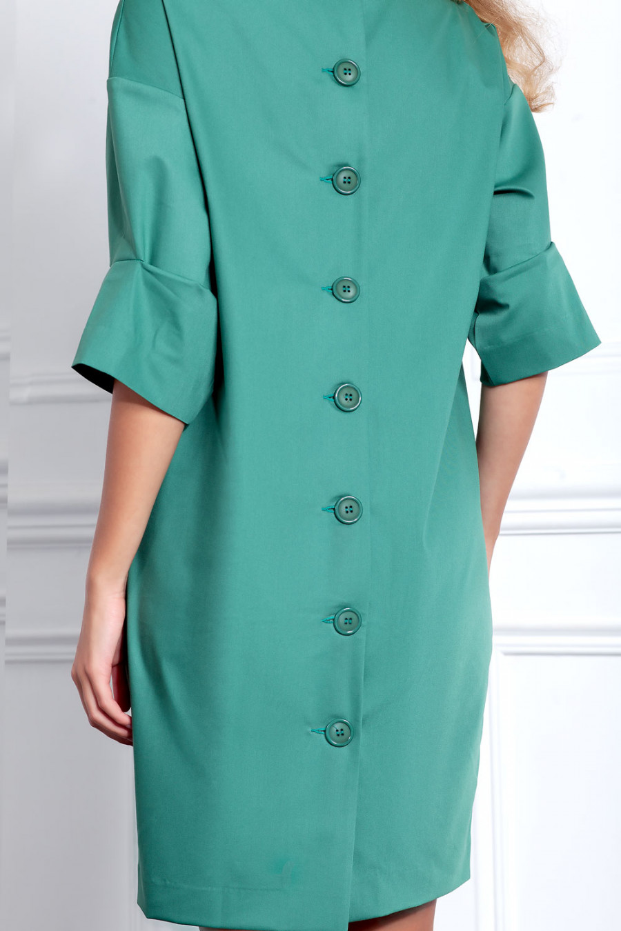 Элегантное платье прямого силуэта из однотонной ткани костюмной группы. Модель с округлым вырезом горловины и рукавом 3/4 со складками. Впереди выполнены карманы в швах от бока.Сзади застежка на пуговицы. Такое платье - визуально скроет недостатки вашей фигуры и подчеркнет достоинства.