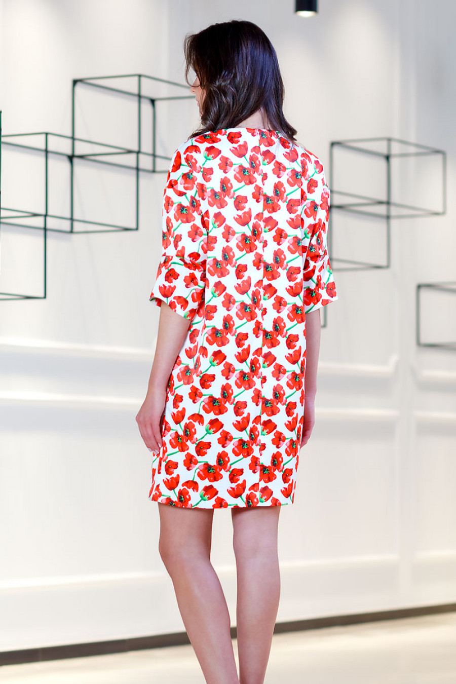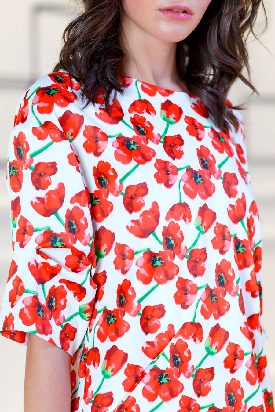 Элегантное платье из хлопка с ярким цветочным принтом. Модель свободного кроя с карманами в швах от бока. Рукав 3/4 декорирован складками. Сзади застежка на потайную молнию.