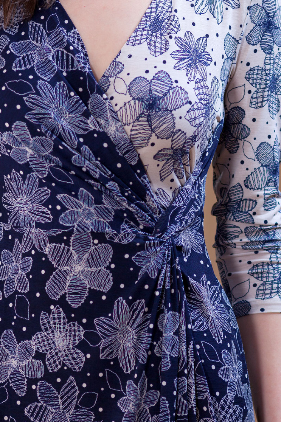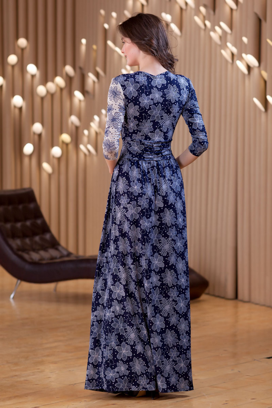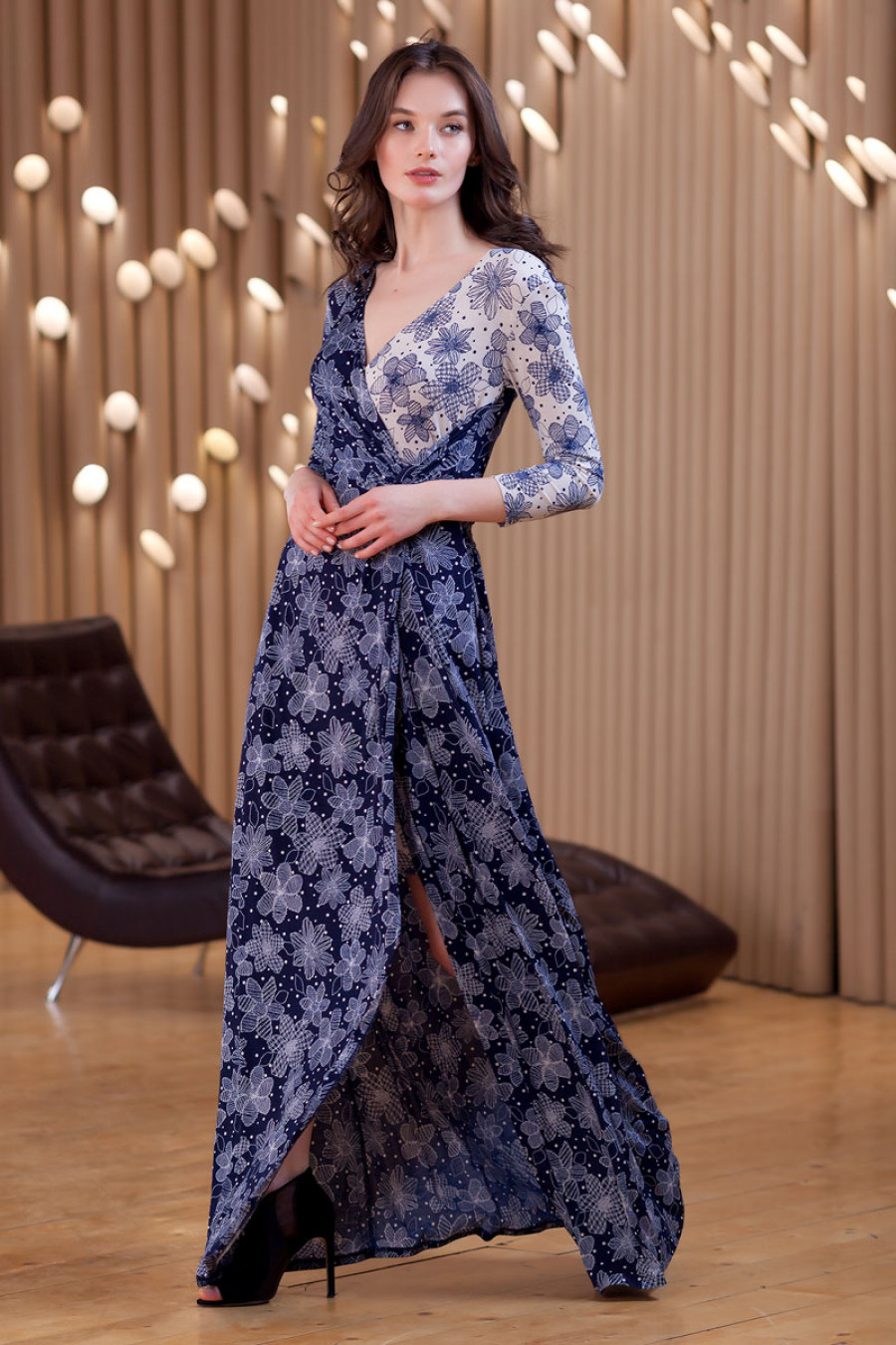 Элегантное платье макси из струящегося трикотажа с цветочным принтом. Модель приталенного силуэта с рукавом 3/4. Глубокое V-образное декольте красиво оформлено драпировкой "узел", переходящий в эффектный разрез.