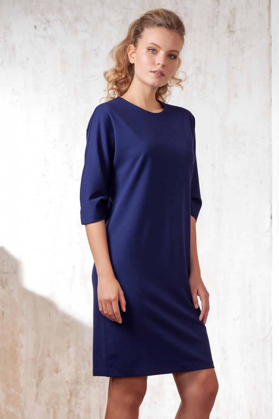 Элегантное и стильное платье из однотонного джерси. Модель прямого силуэта длиной до колена. Рукав цельнокроенный