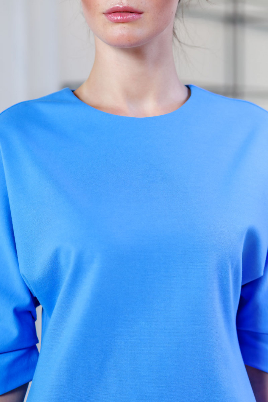 Элегантное и стильное платье из однотонного джерси. Модель прямого силуэта длиной до колена. Рукав цельнокроенный 3/4 со складками по нижнему шву. Сзади застежка на пуговицу. Прекрасный вариант на каждый день или для прогулок с друзьями.