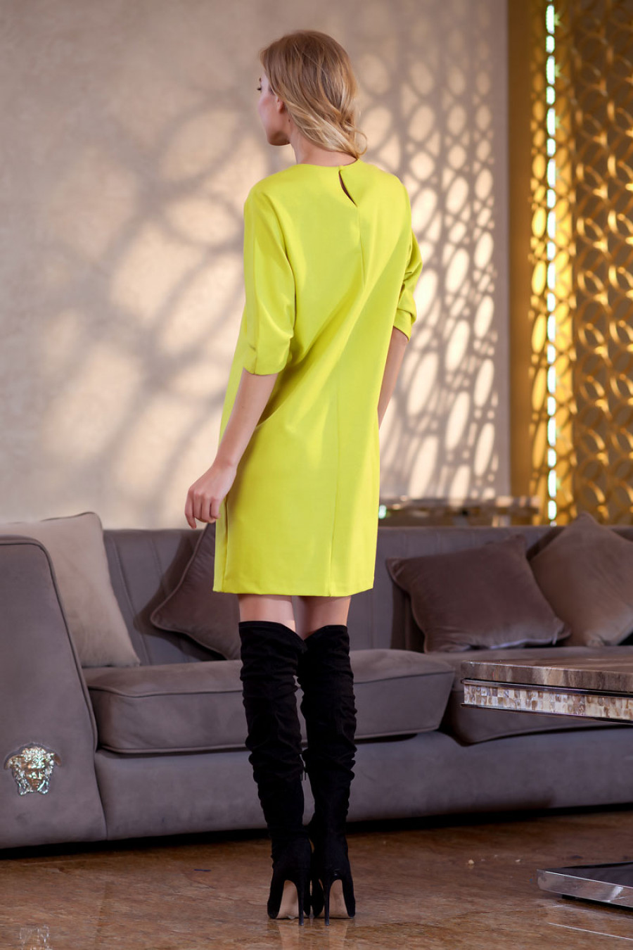 Элегантное и стильное платье из однотонного джерси. Модель прямого силуэта длиной до колена. Рукав цельнокроенный 3/4 со складками по нижнему шву. Сзади застежка на пуговицу. Прекрасный вариант на каждый день или для прогулок с друзьями.