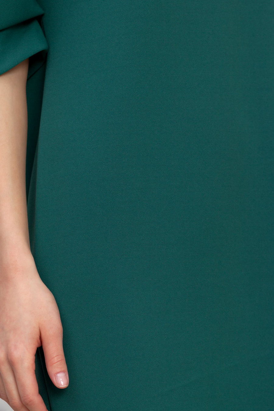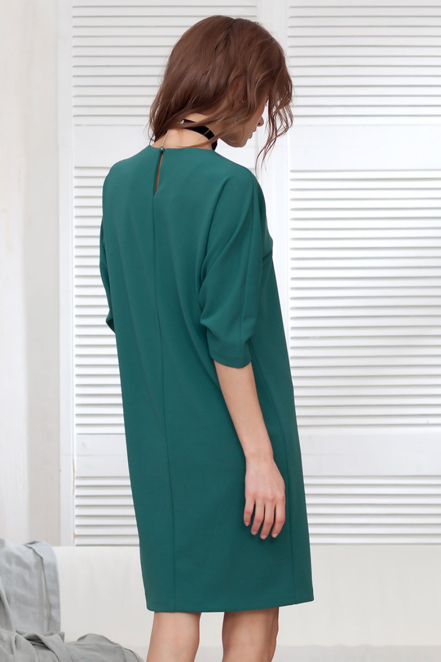 Элегантное и стильное платье из однотонного трикотажа. Модель прямого силуэта длиной до колена. Рукав цельнокроенный 3/4 со складками по нижнему шву. Сзади застежка на пуговицу. Прерасный вариант на каждый день или для прогулок с друзьями.