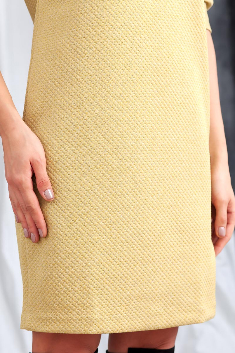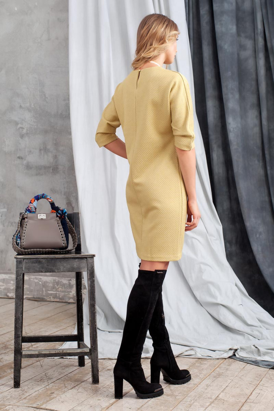 Элегантное и стильное платье из однотонного структурного трикотажа. Модель прямого силуэта длиной до колена. Рукав цельнокроенный 3/4 со складками по нижнему шву. Сзади застежка на пуговицу.Прекрасный вариант на каждый день или для прогулок с друзьями.