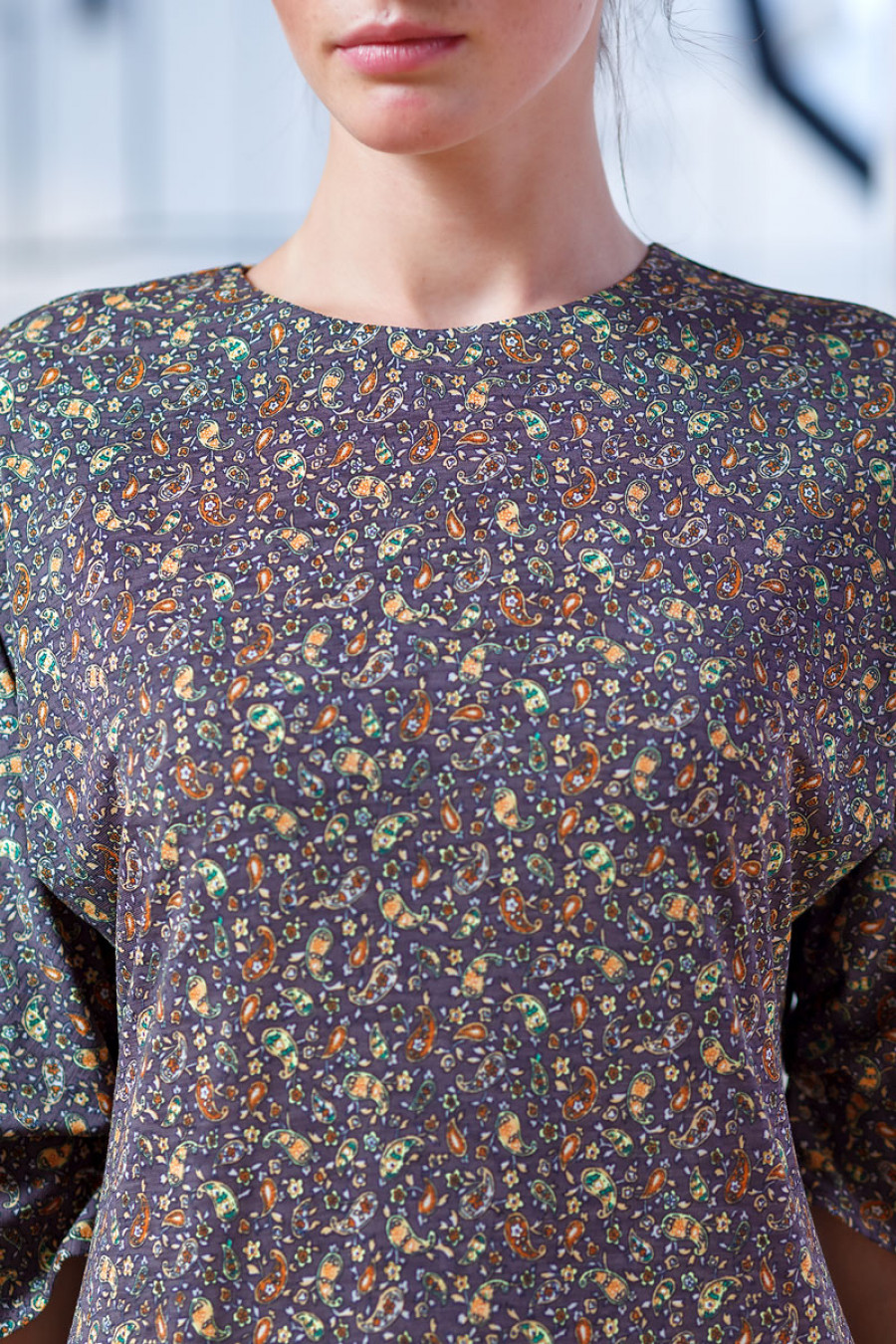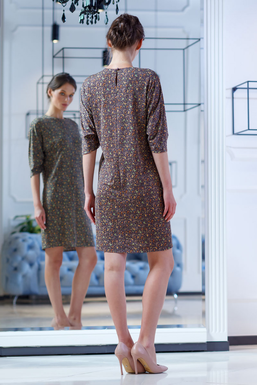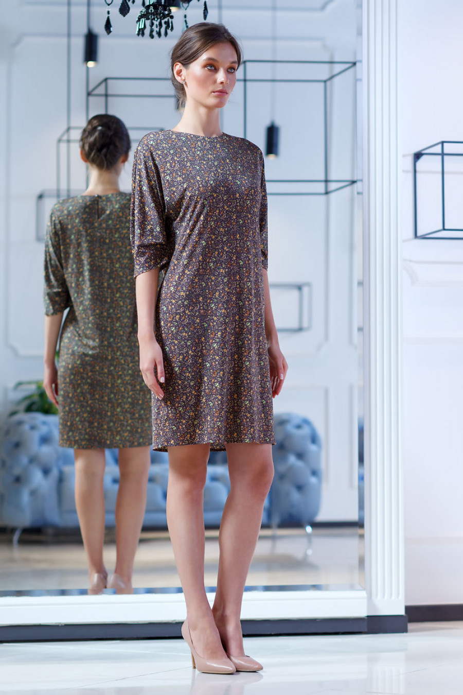 Элегантное и стильное платье из струящегося трикотажа с фантазийным принтом. Модель прямого силуэта длиной до колена. Рукав цельнокроеный 3/4 со складками по нижнему шву. Сзади застежка на пуговицу. Прекрасный вариант на каждый день или для прогулок с друзьями.