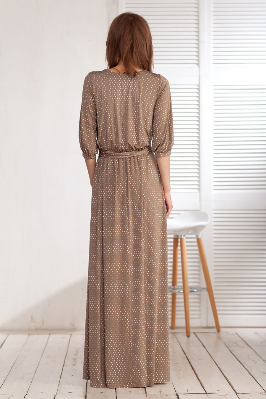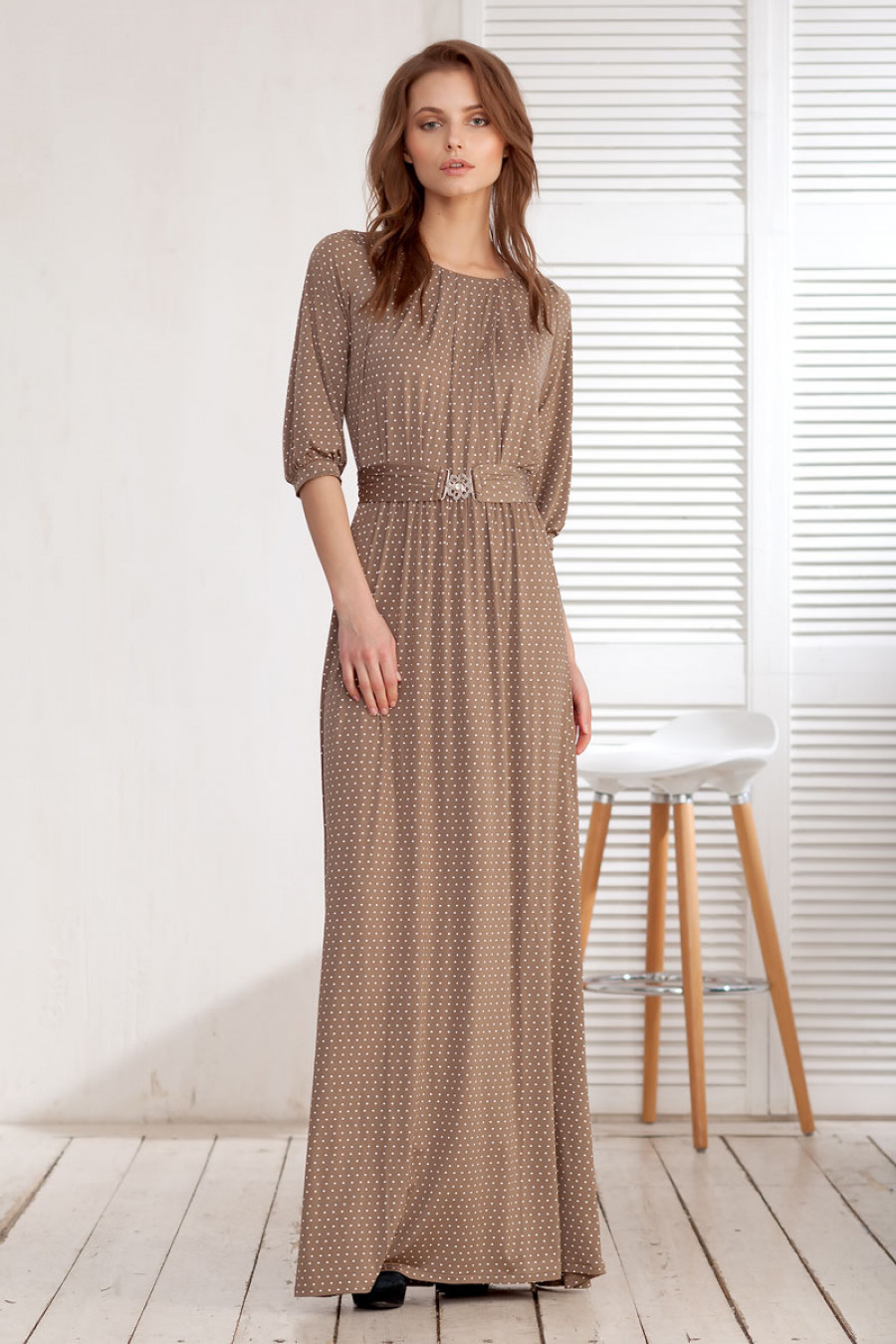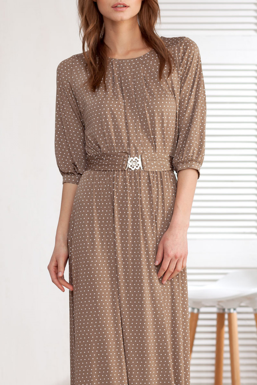 Элегантное платье макси из струящегося трикотажа с классическим принтом "горошек". Модель отрезная по линии талии со сборкой на резинку. Лиф выполнен со складками от горловины. Платье с объемным рукавом 3/4 на манжете. На талии застегивается пояс с пряжкой.
