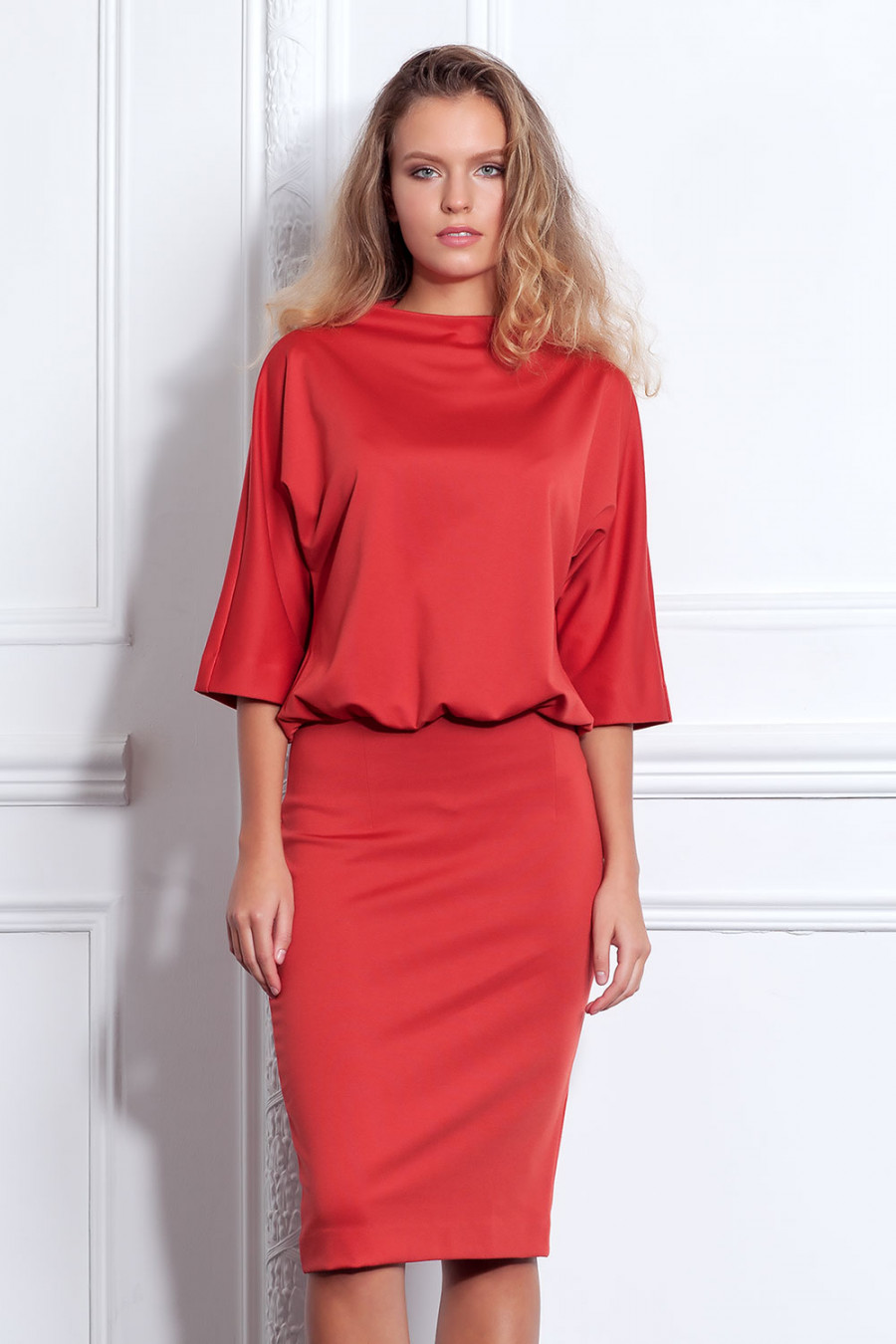 Элегантное и стильное платье из плотного трикотажа. Лиф объемный с рукавом покроя "летучая мышь" 3/4. Горловина оформлена цельнокроенной стойкой. Юбка прямая длиной до колена. Идеальный вариант для создания нежного и женственного образа.