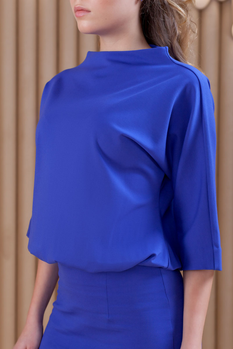 Элегантное и стильное платье из плотного трикотажа. Лиф объемный с рукавом покроя "летучая мышь" 3/4. Горловина оформлена цельнокроенной стойкой. Юбка прямая длиной до колена. Идеальный вариант для создания нежного и женственного образа.