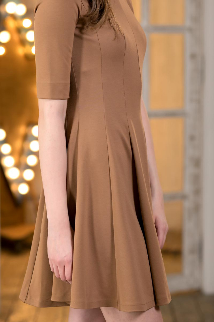Стильное платье из плотного трикотажа с рукавом до локтя. Модель приталенного силуэта с расклешеной юбкой. Вырез горловины каре.