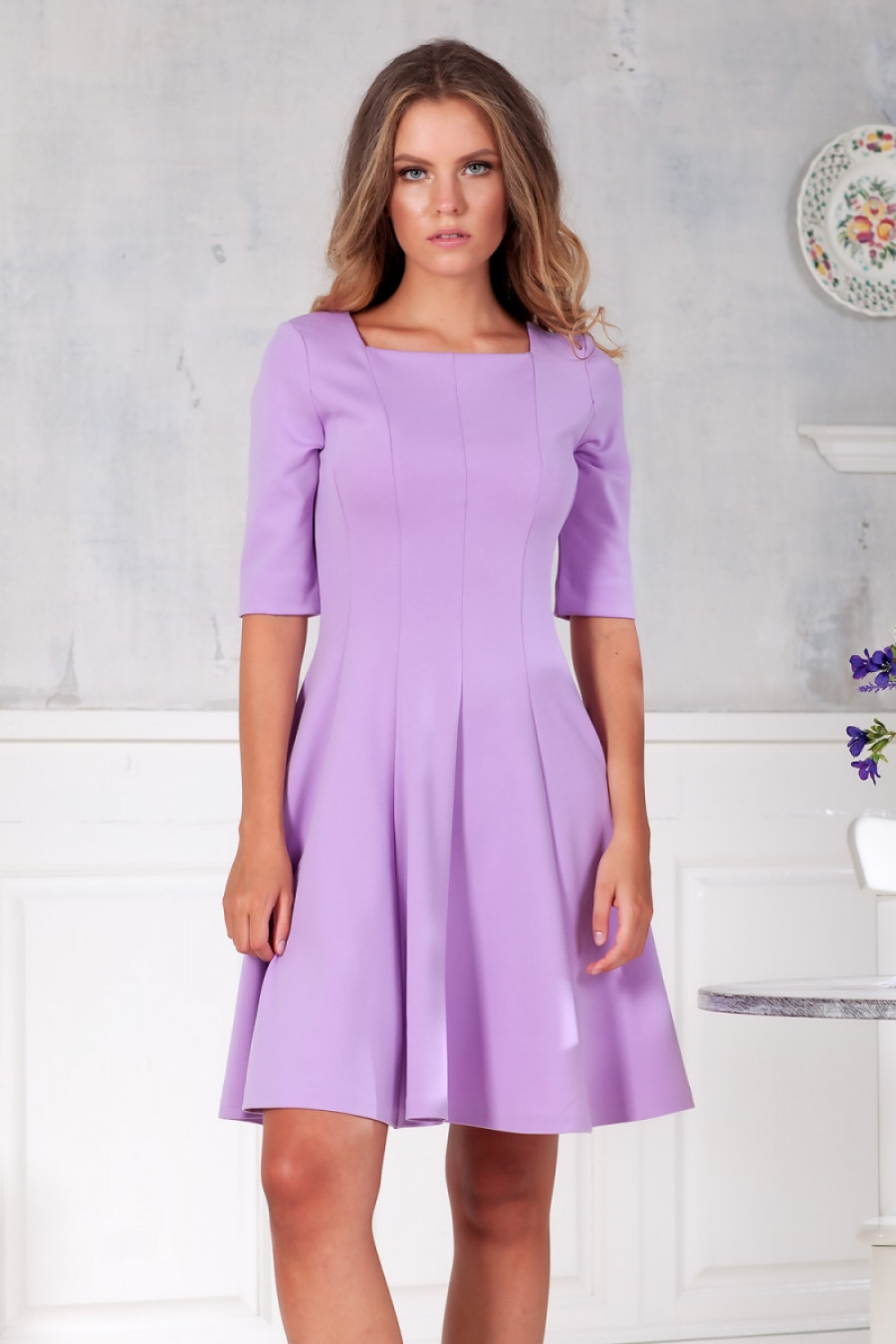 Стильное платье из плотного трикотажа с рукавом до локтя. Модель приталенного силуэта с расклешеной юбкой. Вырез горловины каре.