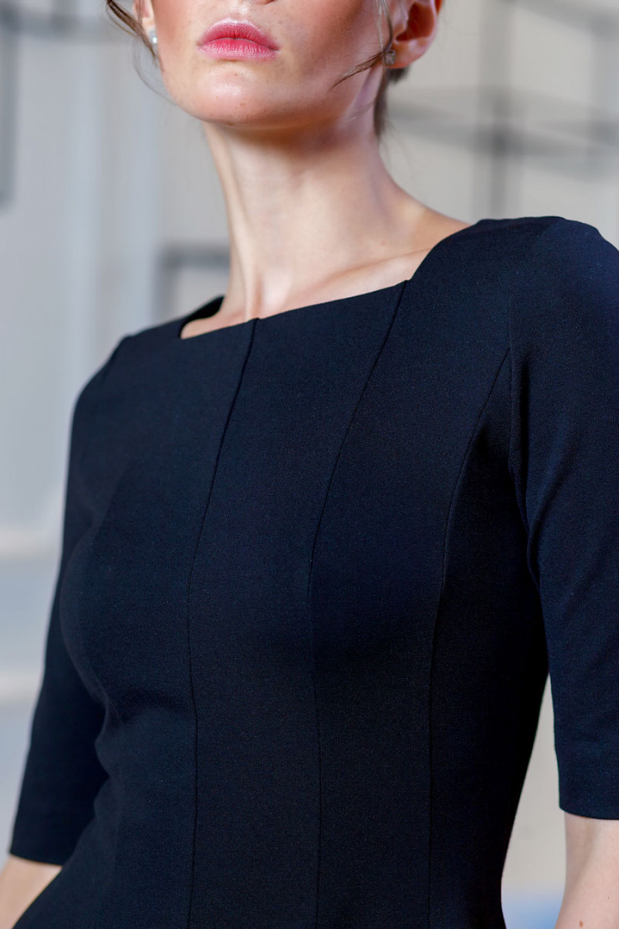 Стильное платье из плотного трикотажа с рукавом до локтя. Модель приталенного силуэта с расклешеной юбкой. Вырез горловины каре. Прекрасный вариант на каждый день.