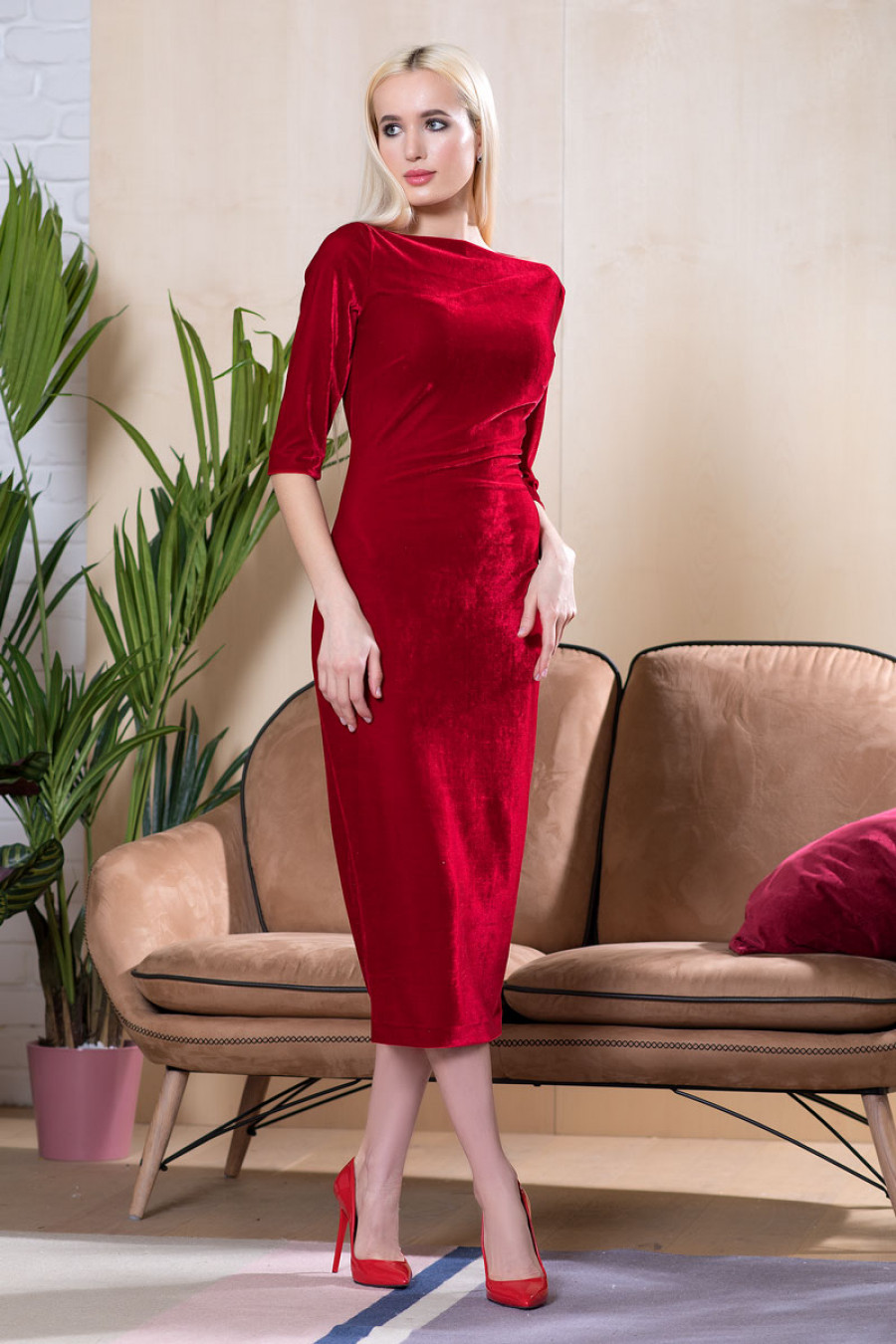 Элегантное платье-футляр из шикарного бархата. Модель прилегающего силуэта длиной ниже колена с рукавом 3/4. Сзади выполнен разрез с молнией. Отлично подойдёт для любого торжества.