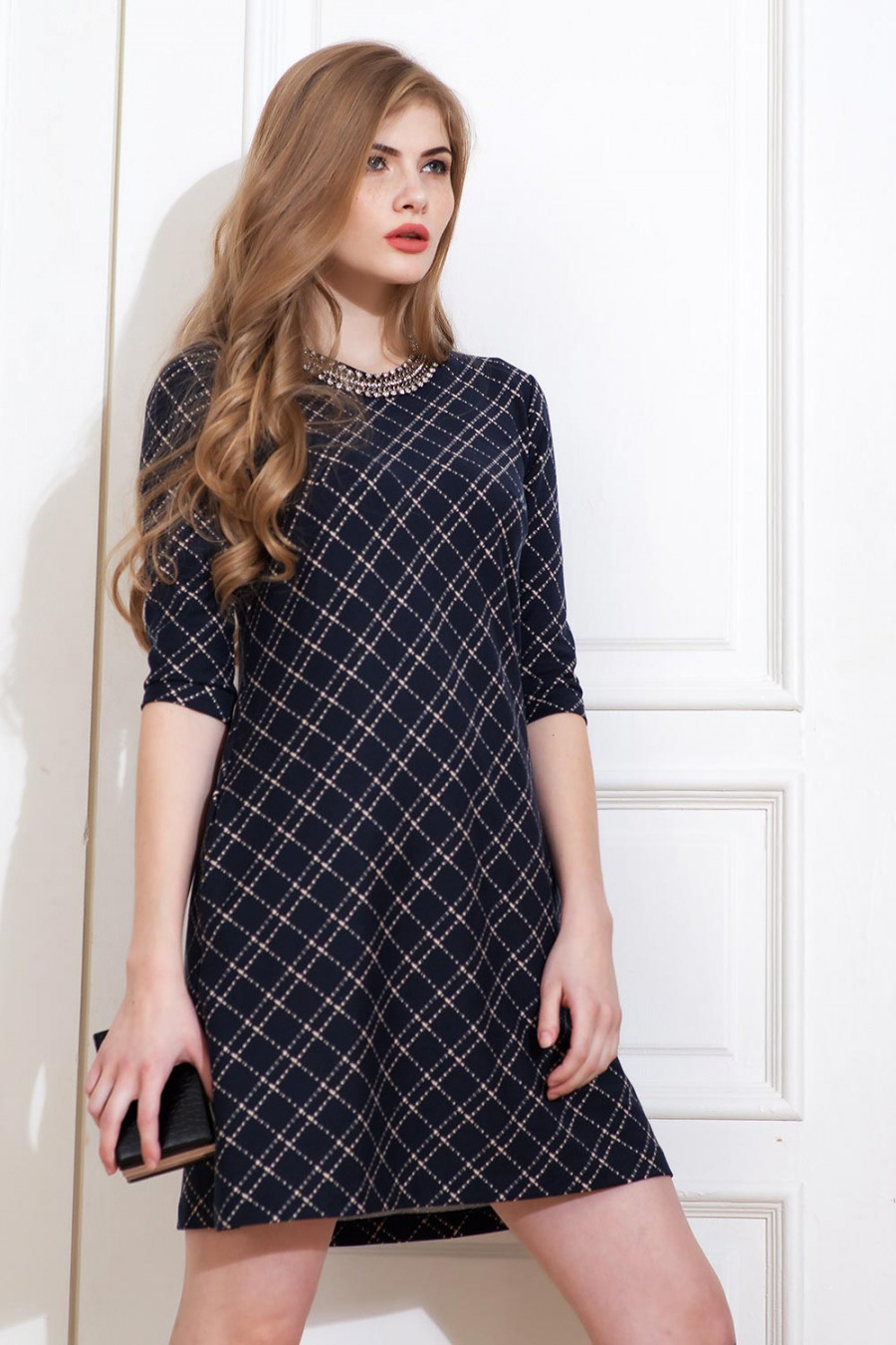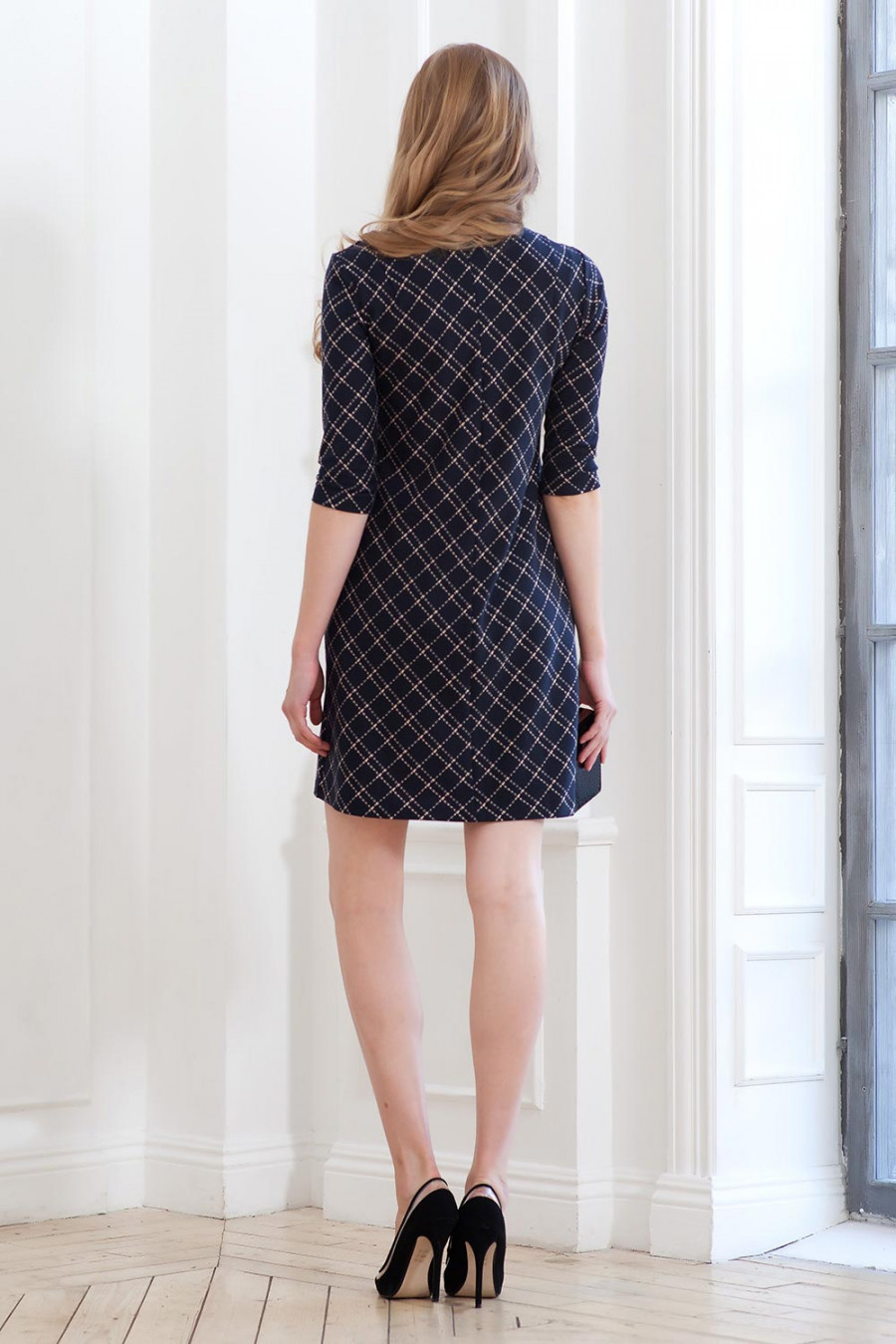 Платье из принтованного трикотажного полотна клешеное длиной до колена с рукавом 3/4. Карманы в боковых швах. Сзади застежка-молния.