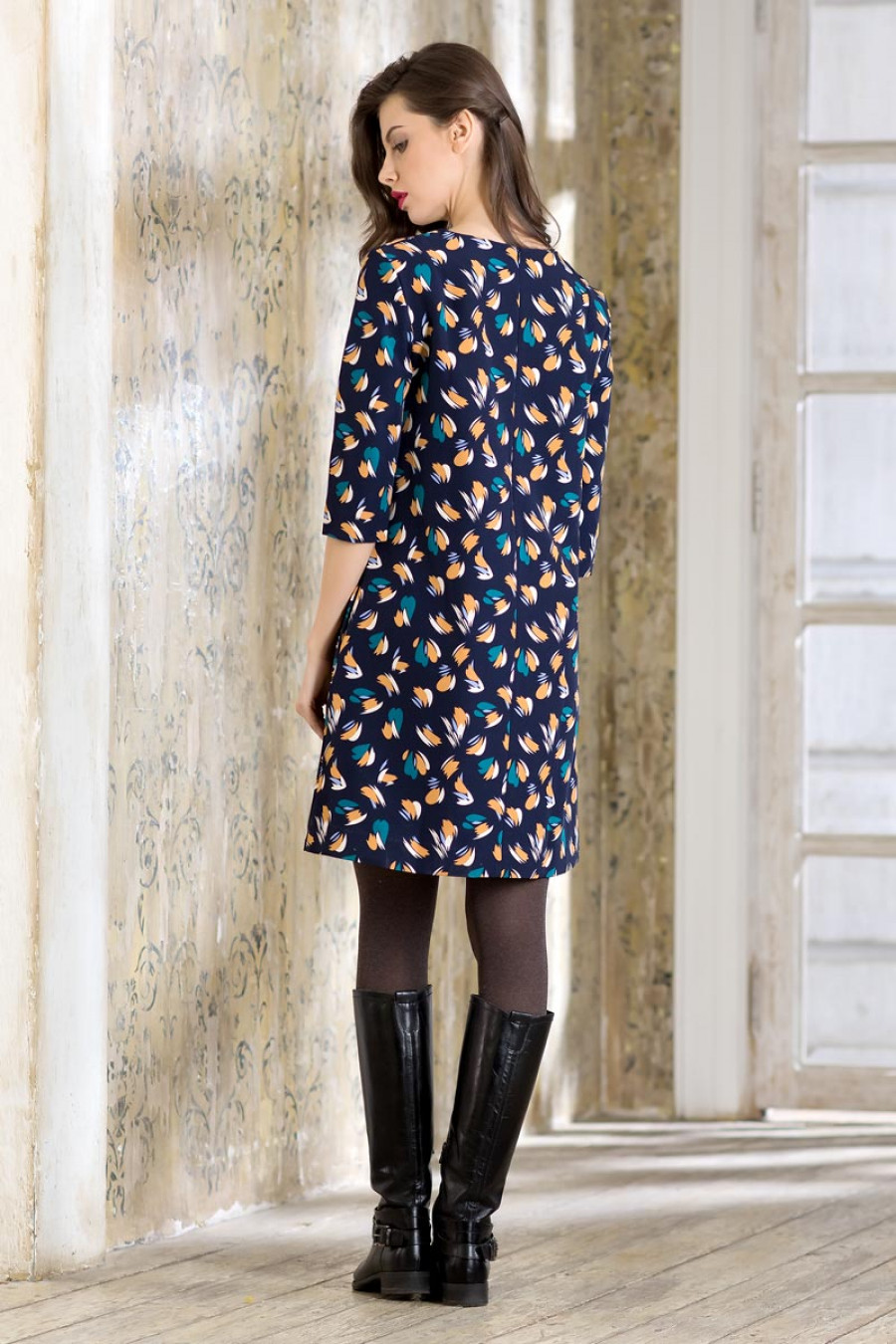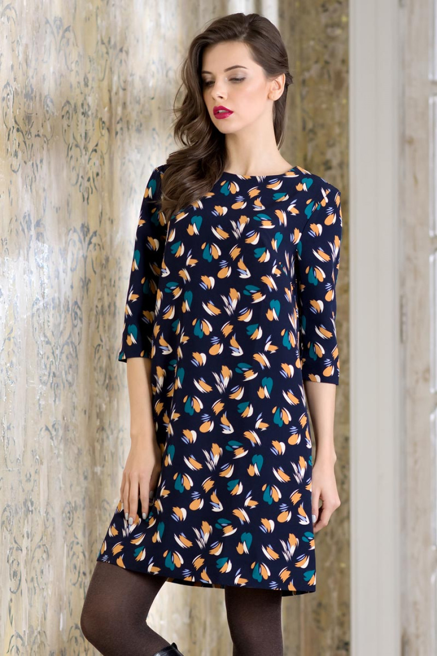 Стильное платье мини из ткани костюмной группы с фантазийным принтом. Модель трапецевидного силуэта с округлым вырезом горловины и рукавом 3/4. По бокам в швах выполнены карманы. Гармоничное сочетание изящной утонченности и строгости придает платью особый шарм.