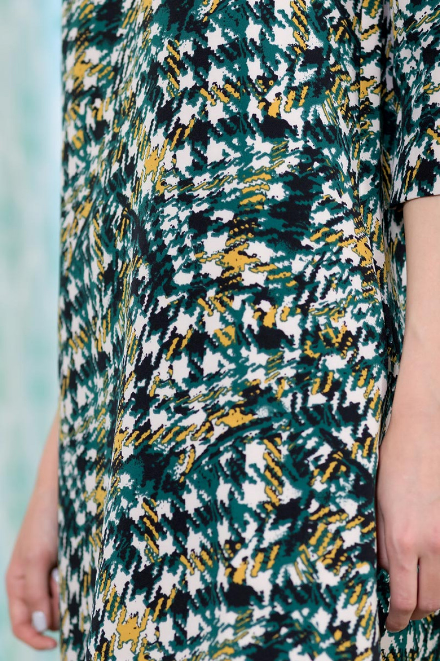 Стильное платье мини из ткани костюмной группы с фантазийным принтом. Модель трапецевидного силуэта с округлым вырезом горловины и рукавом 3/4. По бокам в швах выполнены карманы. Гармоничное сочетание изящной утонченности и строгости придает платью особый шарм.