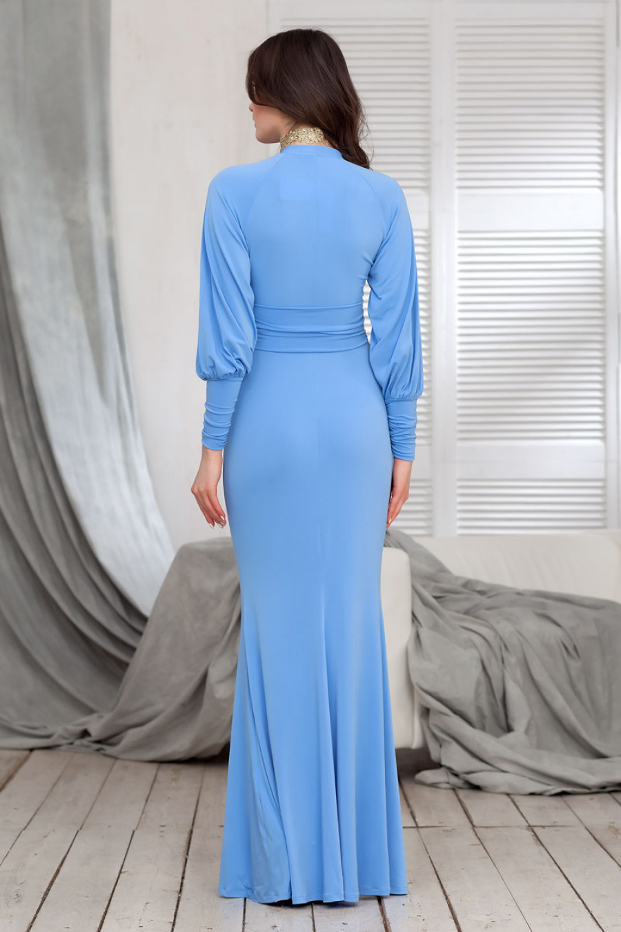 Эффектное нарядное платье из струящейся ткани прилегающего силуэта длиной в пол. Впереди глубокий V-образный вырез. На талии пояс со сборкой. Пышные длинные рукава на высоком узком манжете.
