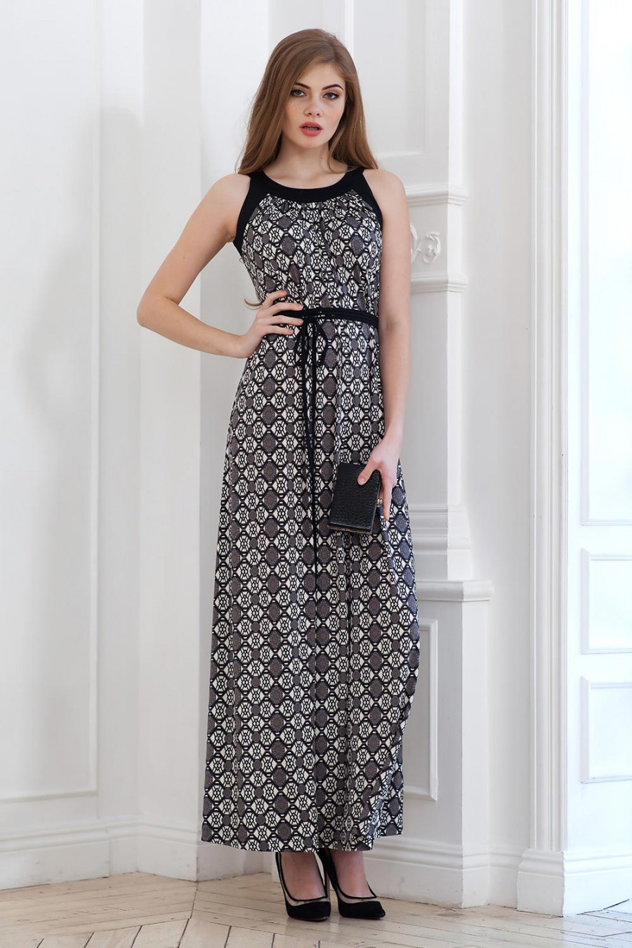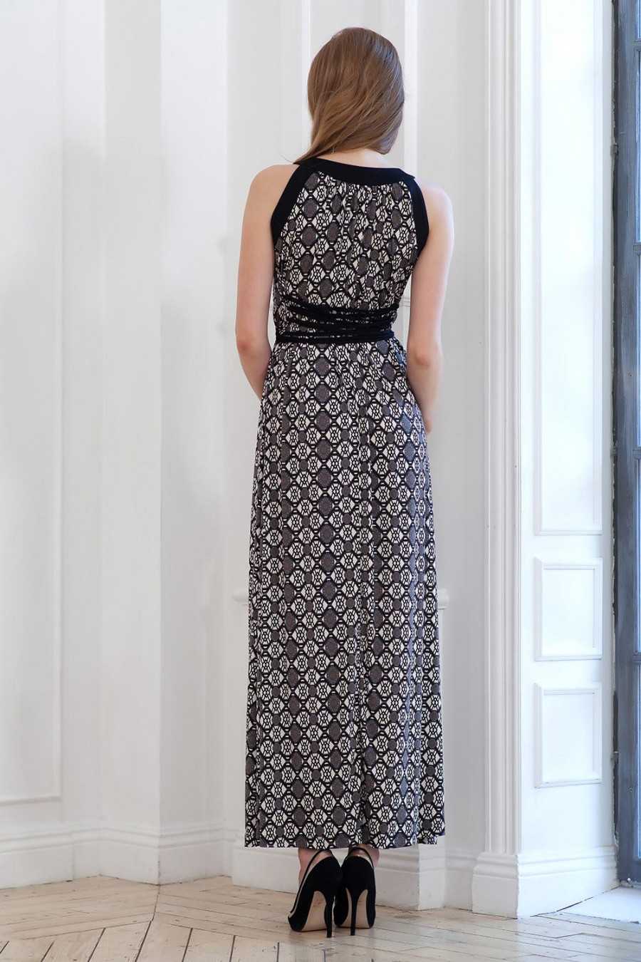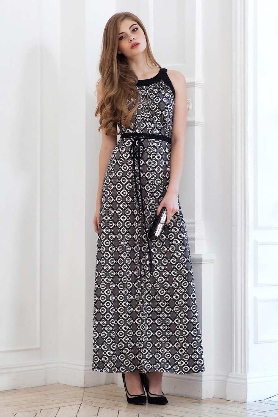 Элегантное платье из струящегося принтованного трикотажа длиной в пол с контрастной отделкой по горловине и проймам. На талии завязывается шнурок в несколько рядов.