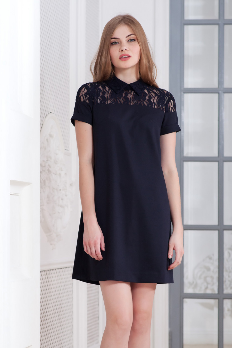 Платье текстиль прямое полуприлегающего силуэта длиной до колена с коротким рукавом. Верх переда, спинки и рукавов выполнены из гипюра. Сзади застежка на пуговицу.