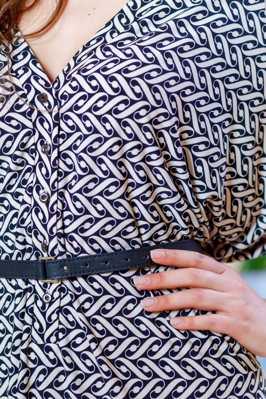 Модное платье объемного кроя из принтованного струящегося трикотажа. Впереди планка с застежкой на пуговицы. В комплекте с платьем идет ремень.