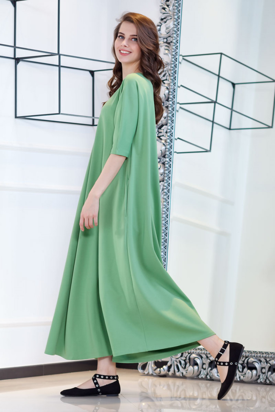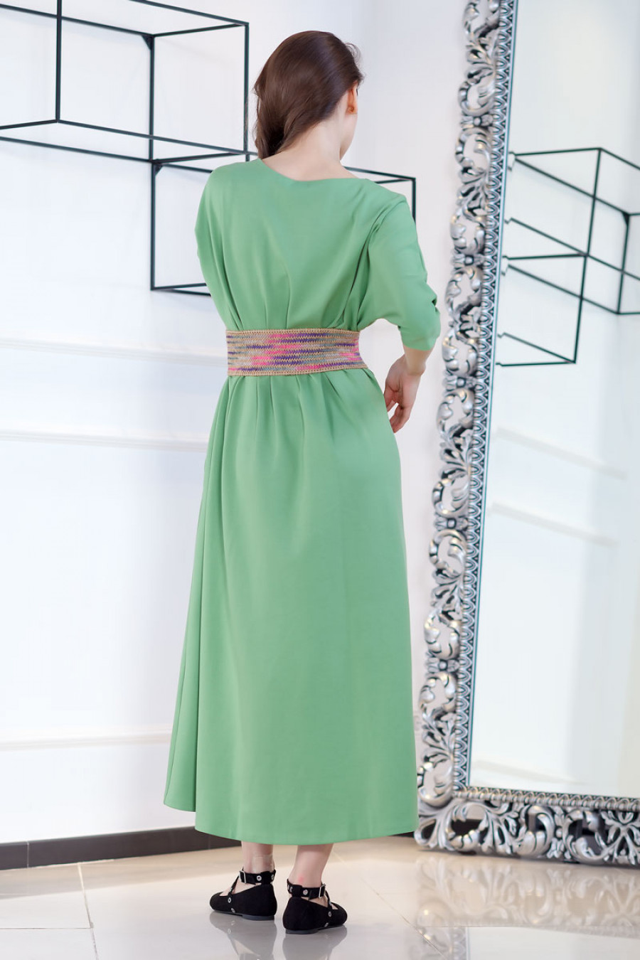 Элегантное платье клеш из трикотажа, модной длины миди. Модель с округлым вырезом горловины и цельнокроеным рукавом 3/4. В боковых швах выполнены карманы. Простота и роскошь платья граничат с элегантностью и безупречностью. Контрастный пояс подчеркнет утонченность фигуры.