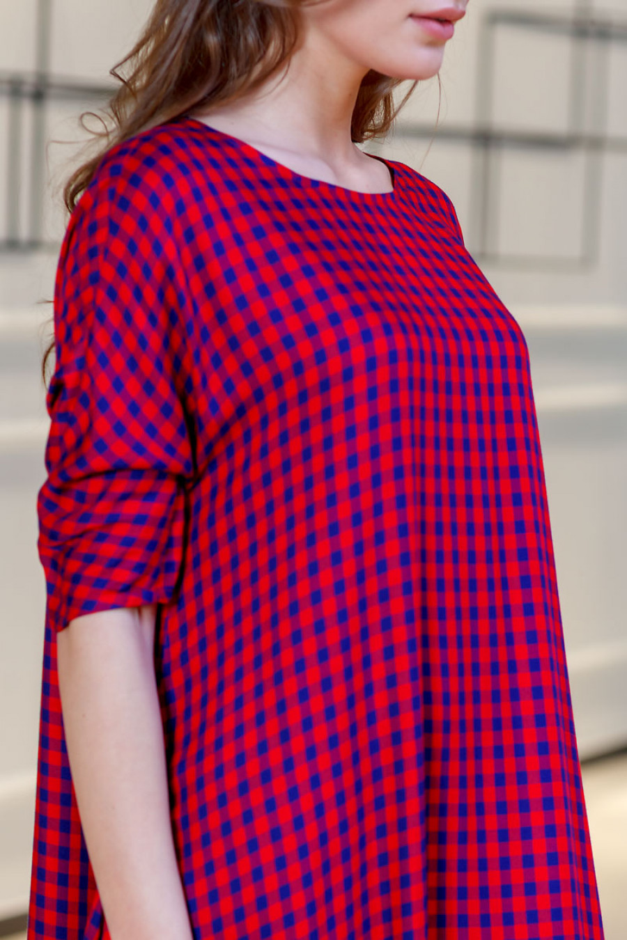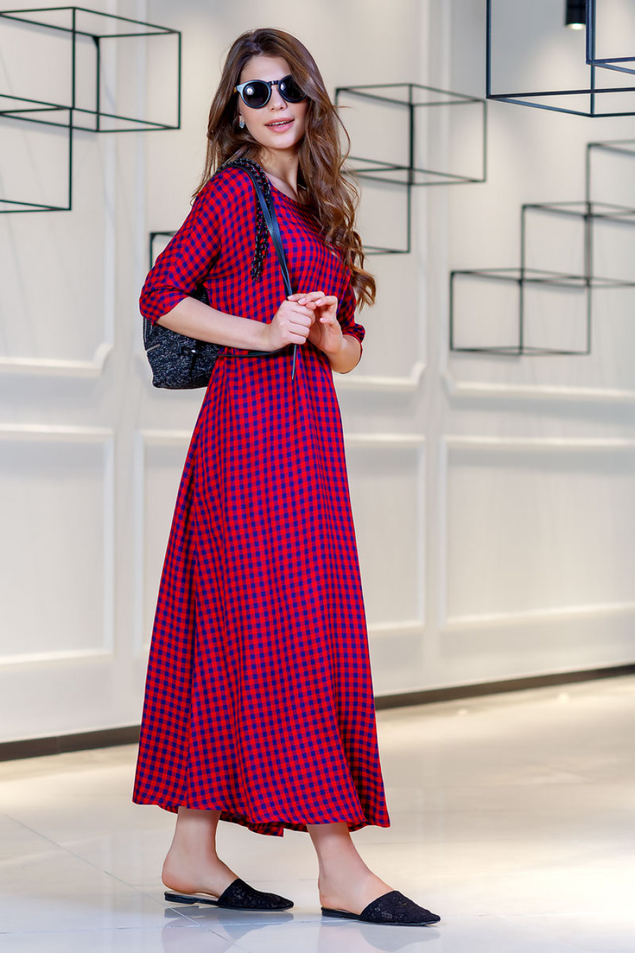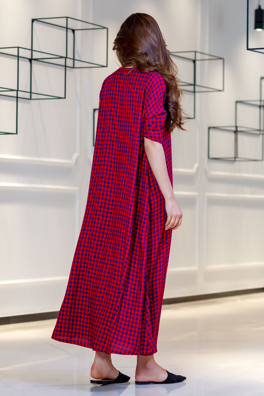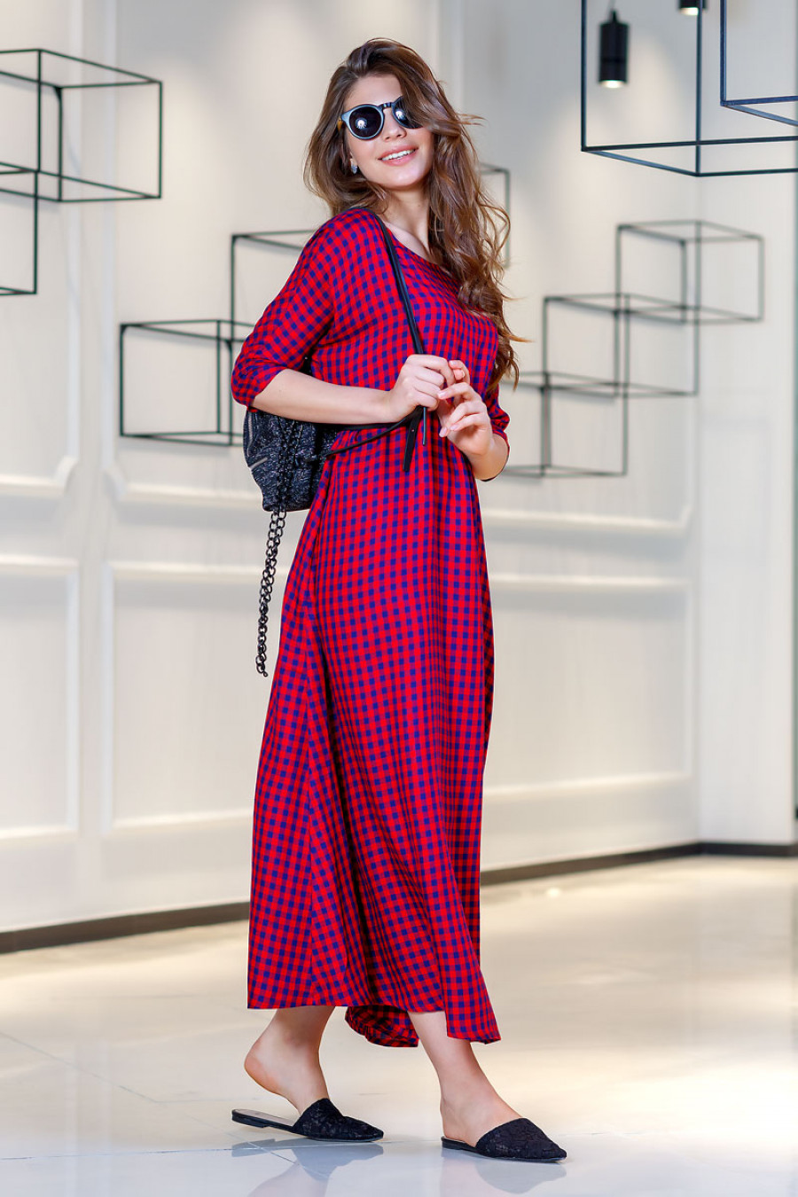Элегантное платье клеш модной длины миди из легкого штапеля с принтом в клетку. Модель с округлым вырезом горловины и цельнокроеным рукавом 3/4. В боковых швах выполнены карманы. Контрастный ремешок подчеркнет утонченность фигуры.