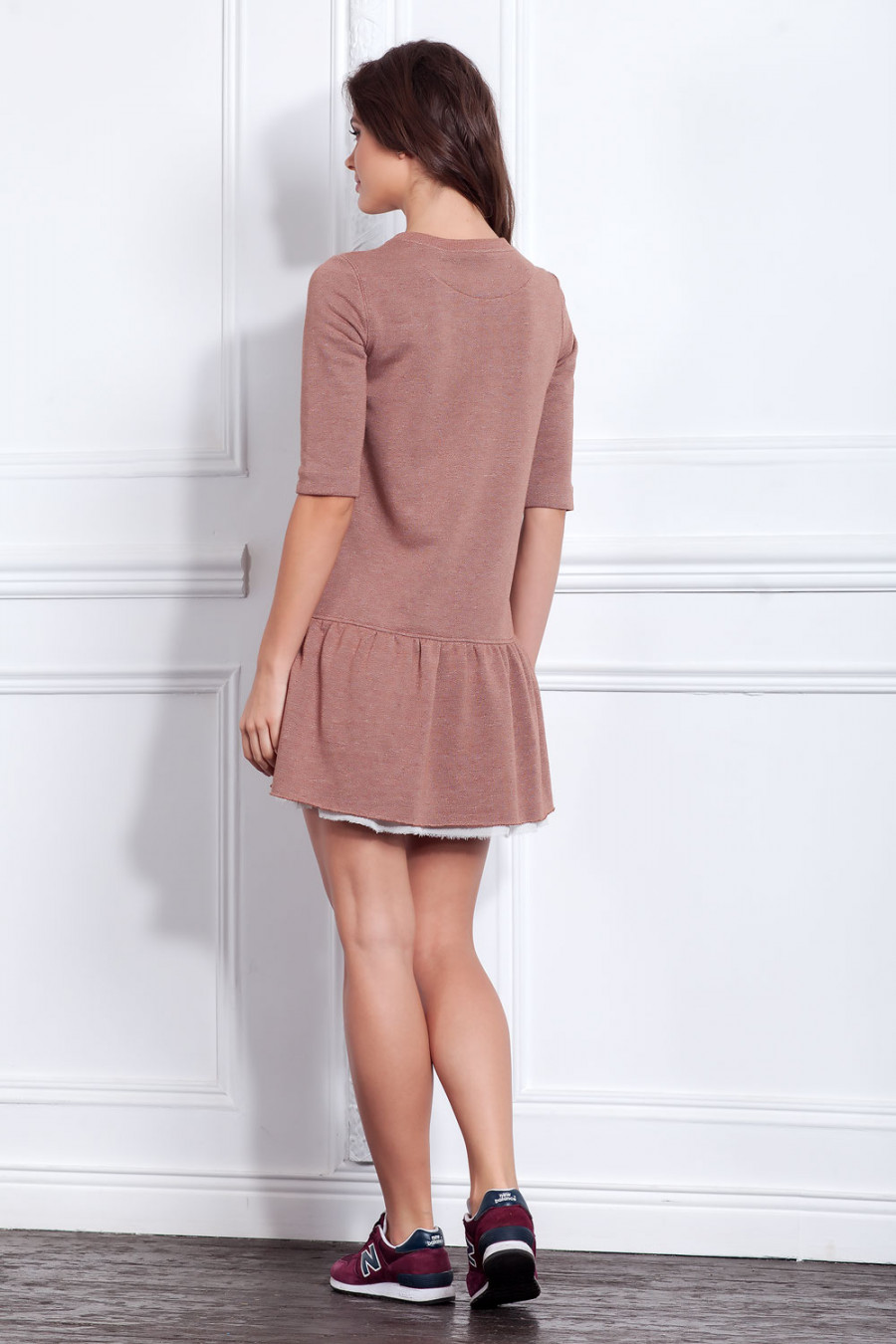 Оригинальное платье в спортивном стиле из плотного футера. Модель прямого силуэта с округлым вырезом горловины и рукавом 3/4. По низу платье декорировано двойным воланом с шифоном.