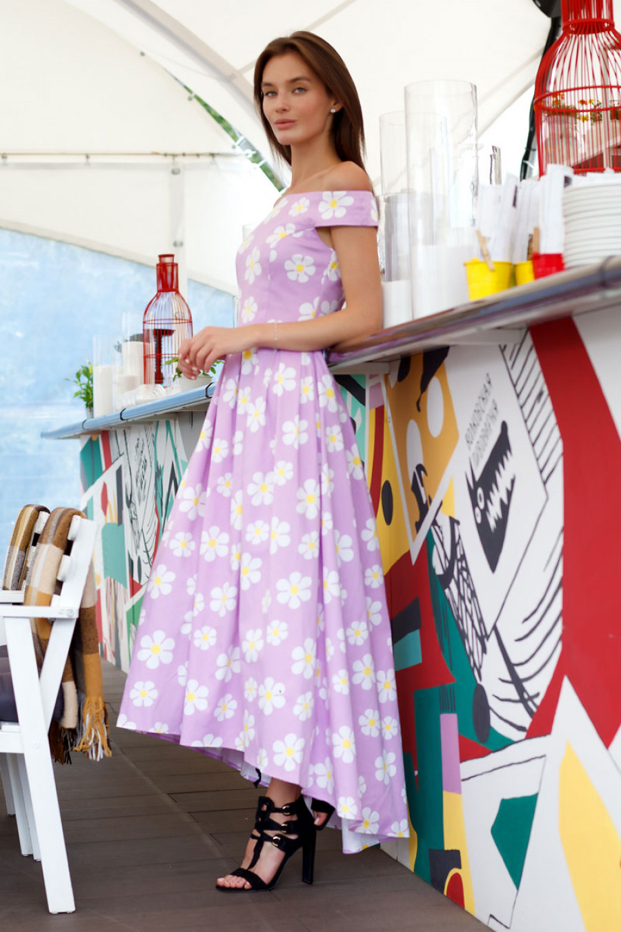 Роскошное летнее платье макси из набивного хлопка. Вырез горловины "лодочка" с открытыми плечами. Платье отрезное по линии талии. Пышная юбка драпирована складками. Низ юбки асимметричный, придающий образу женственность, утонченность и изящество.