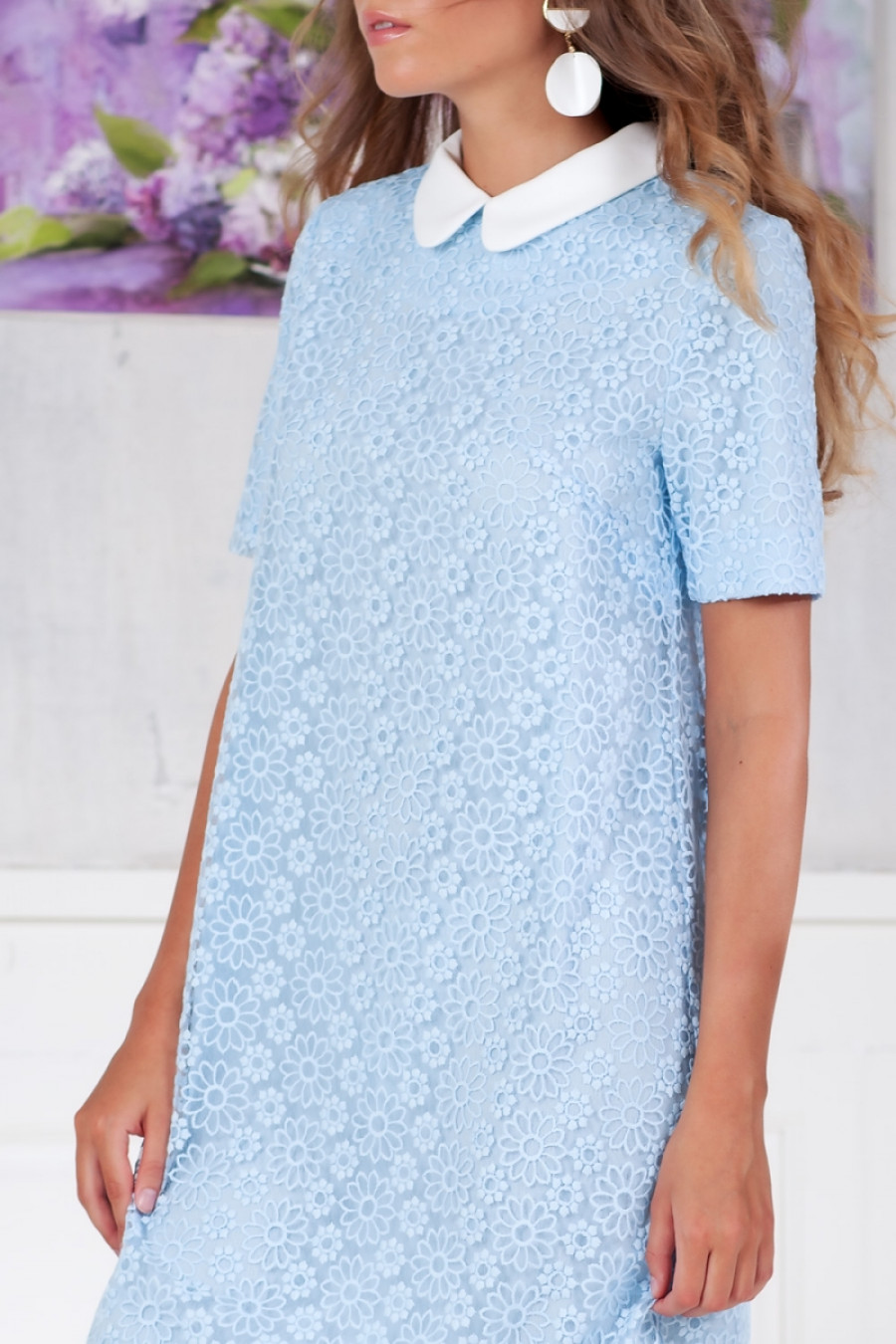 Элегантное и стильное платье с коротким рукавом. Модель силуэта клеш выполнена из кружевного гипюра на подкладке. Округлый вырез горловины оформлен отложным воротником с круглыми концами. Сзади застежка на потайную молнию. Эта модель прекрасно подойдет как для повседневного образа, так и для особых случаев.