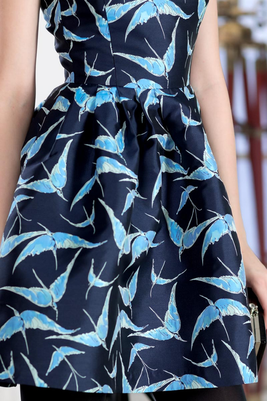 Яркое и эффектное нарядное платье из роскошного жаккарда с фантазийным рисунком. Прилегающий верх в тандеме с короткой юбкой в складку расклешеного силуэта отлично подчеркивает фигуру, делая акцент на талии. Застежка на потайную молнию на спинке.