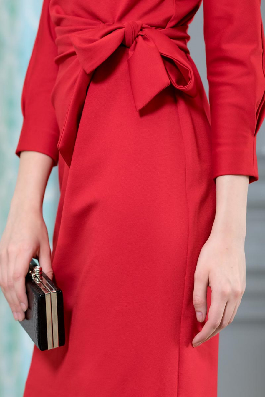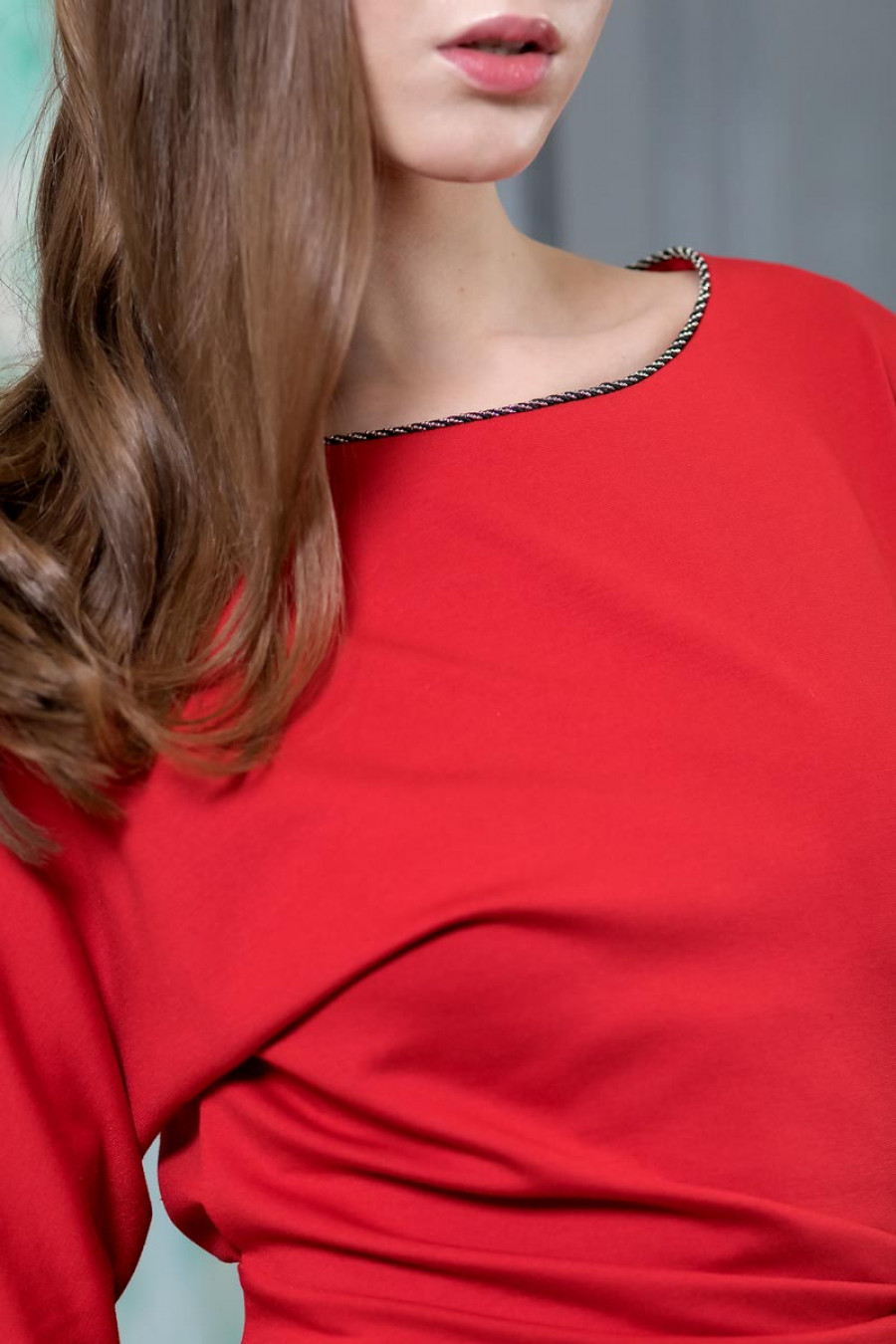 Эффектное платье асимметричного кроя из плотного однотонного джерси. Модель с цельнокроенным рукавом 3/4 и округлым вырезом горловины. Перед декорирован складками по лифу и юбке от пояса. На левом боку завязывается притачной пояс.