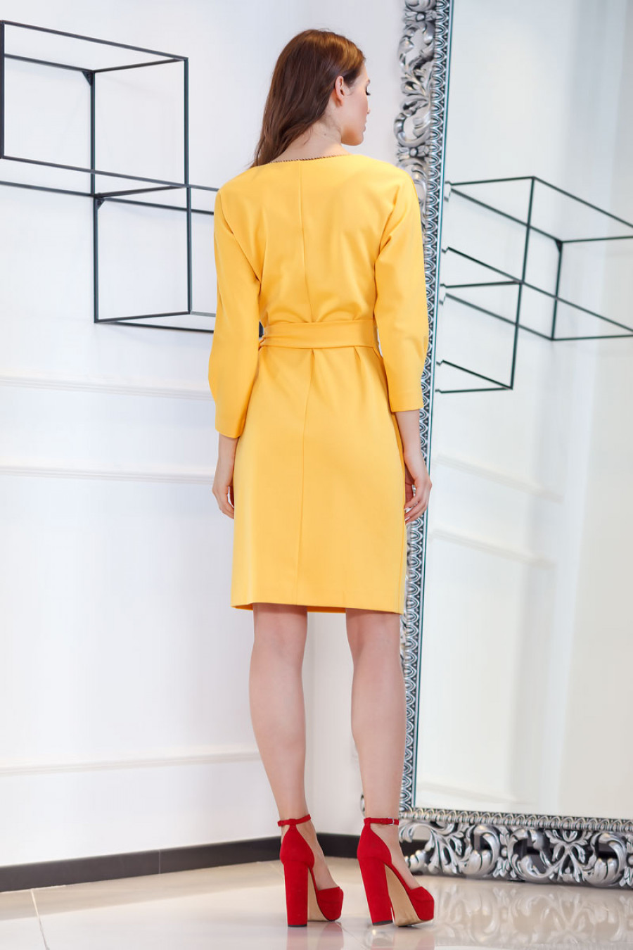 Эффектное платье асимметричного кроя из плотного однотонного джерси. Модель с цельнокроеным рукавом 3/4 и округлым вырезом горловины. Перед декорирован складками по лифу и юбке от пояса. На левом боку завязывается притачной пояс.