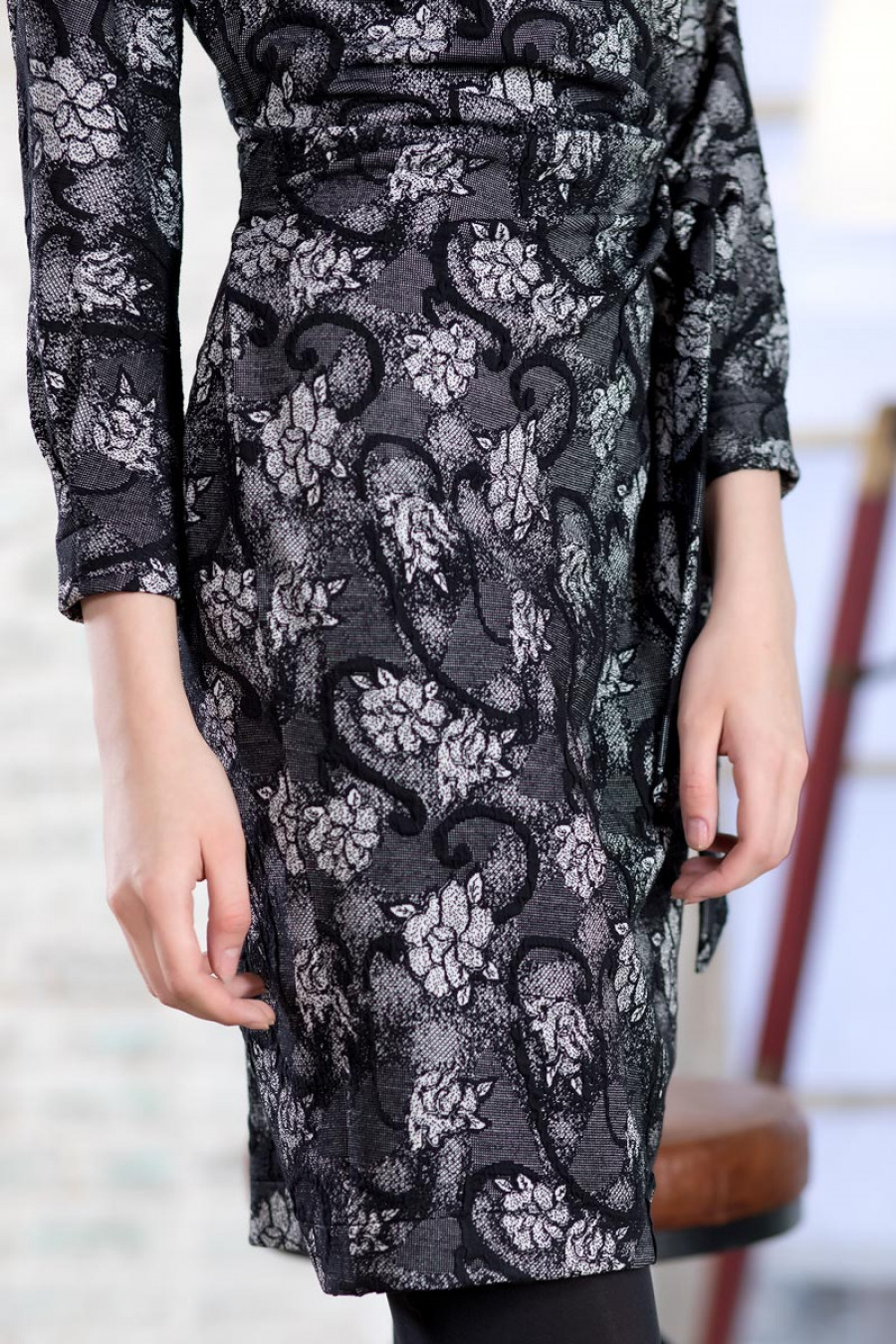 Эффектное платье асимметричного кроя из приятного жаккардового трикотажа. Модель с цельнокроенным рукавом 3/4 и округлым вырезом горловины. Перед декорирован складками по лифу и юбке от пояса. На левом боку завязывается притачной пояс.