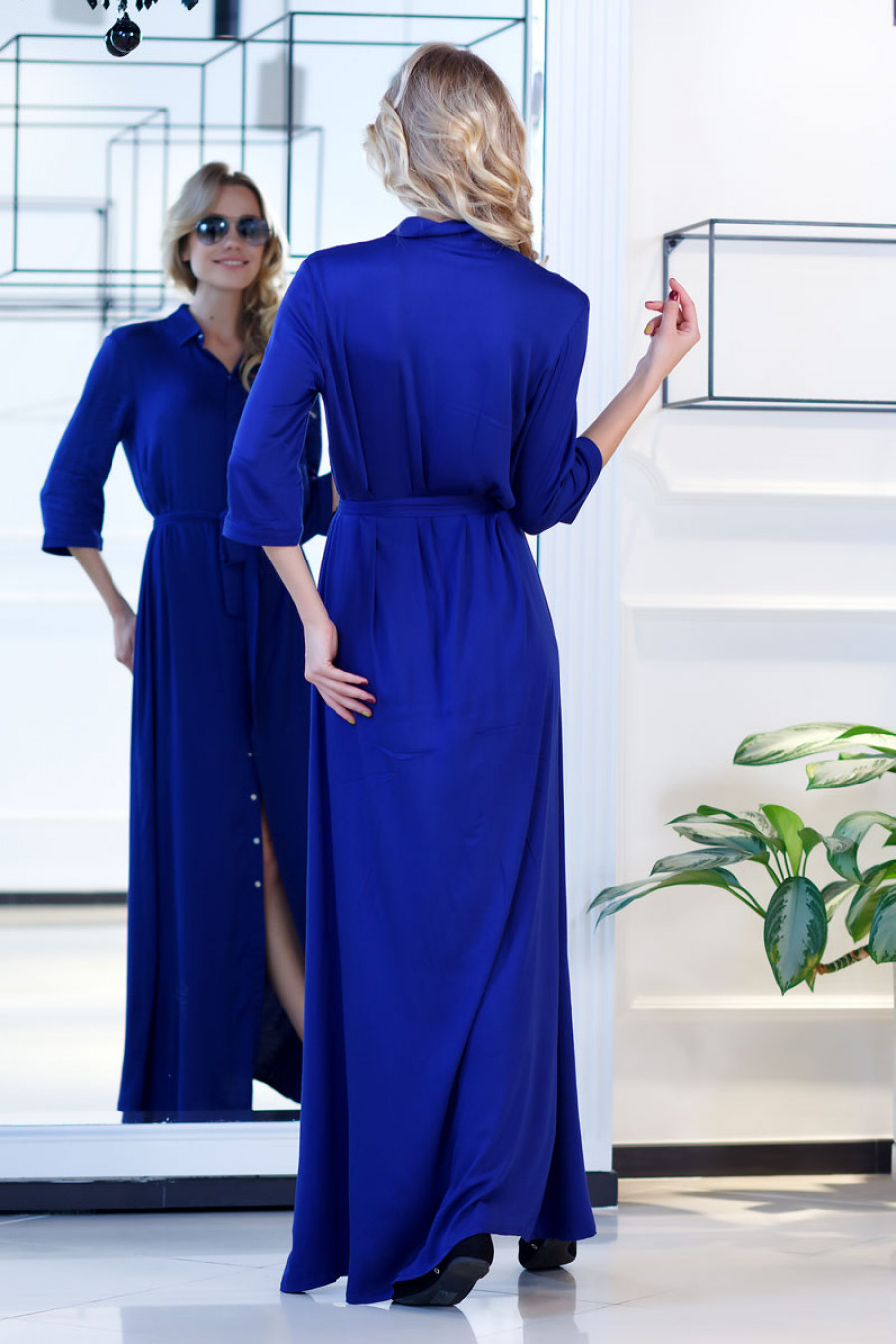 Стильное платье-рубашка из легкой струящейся ткани. Модель прямого силуэта с рукавом 3/4 и рубашечным воротником. Впереди застежка на кнопки. На талии завязывается пояс. Платье макси - идеальное дополнение к летнему гардеробу.
