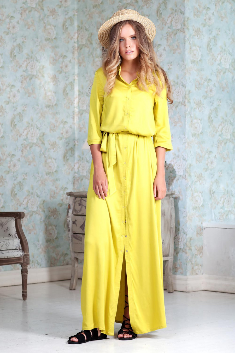 Стильное платье-рубашка из легкой струящейся ткани. Модель прямого силуэта с рукавом 3/4 и рубашечным воротником. Впереди застежка на кнопки. На талии завязывается пояс. Платье макси - идеальное дополнение к летнему гардеробу.